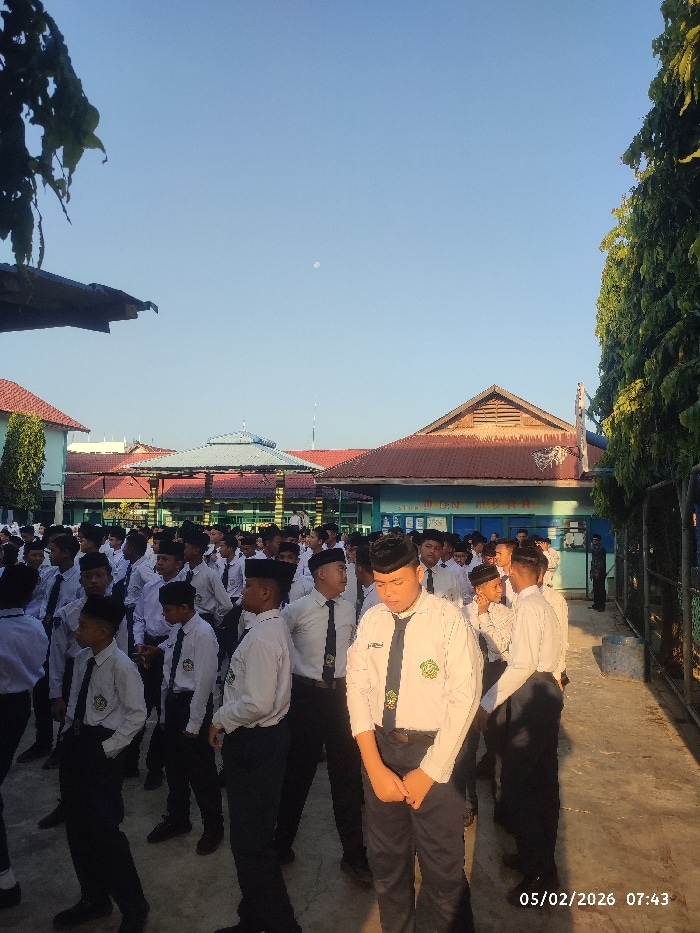 A large group of students wearing white shirts, dark pants, and ties stand in an outdoor space with several buildings in the background. Most students have their hands at their sides. Trees line the r…read more