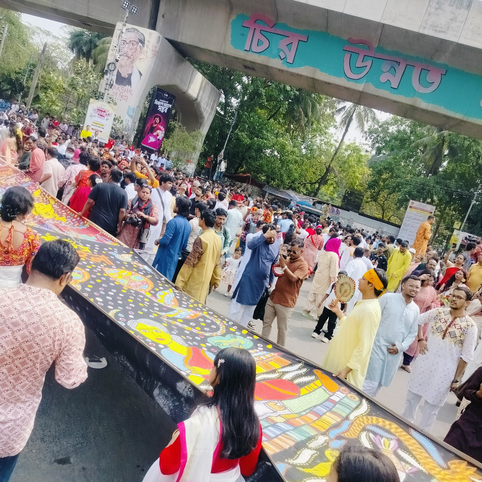 A large crowd of people walk in a street in Dhaka, Bangladesh. They are participating in a procession, carrying a long, painted banner with stylized figures on it. Most people are wearing traditional…read more