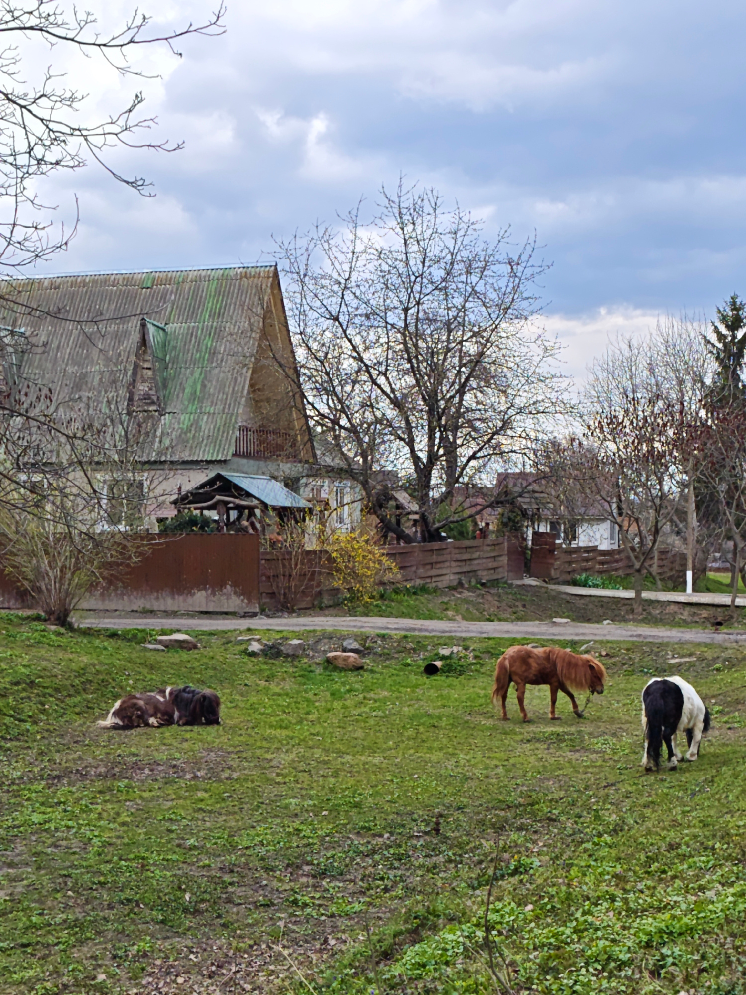 The image depicts a rural scene in Khrinivka, Ukraine. In the foreground, a grassy area contains three ponies: two brown ponies are lying down and a brown and white pony is standing and grazing. An ad…read more