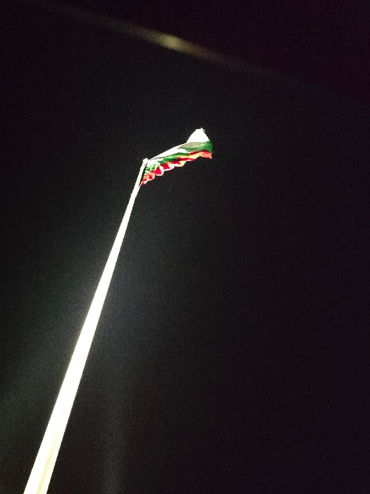 A nighttime, low-light photograph depicts the national flag of Bulgaria illuminated against a dark sky in Yambol. A slender, brightly lit flagpole angles upwards from the lower-left of the frame towar…read more