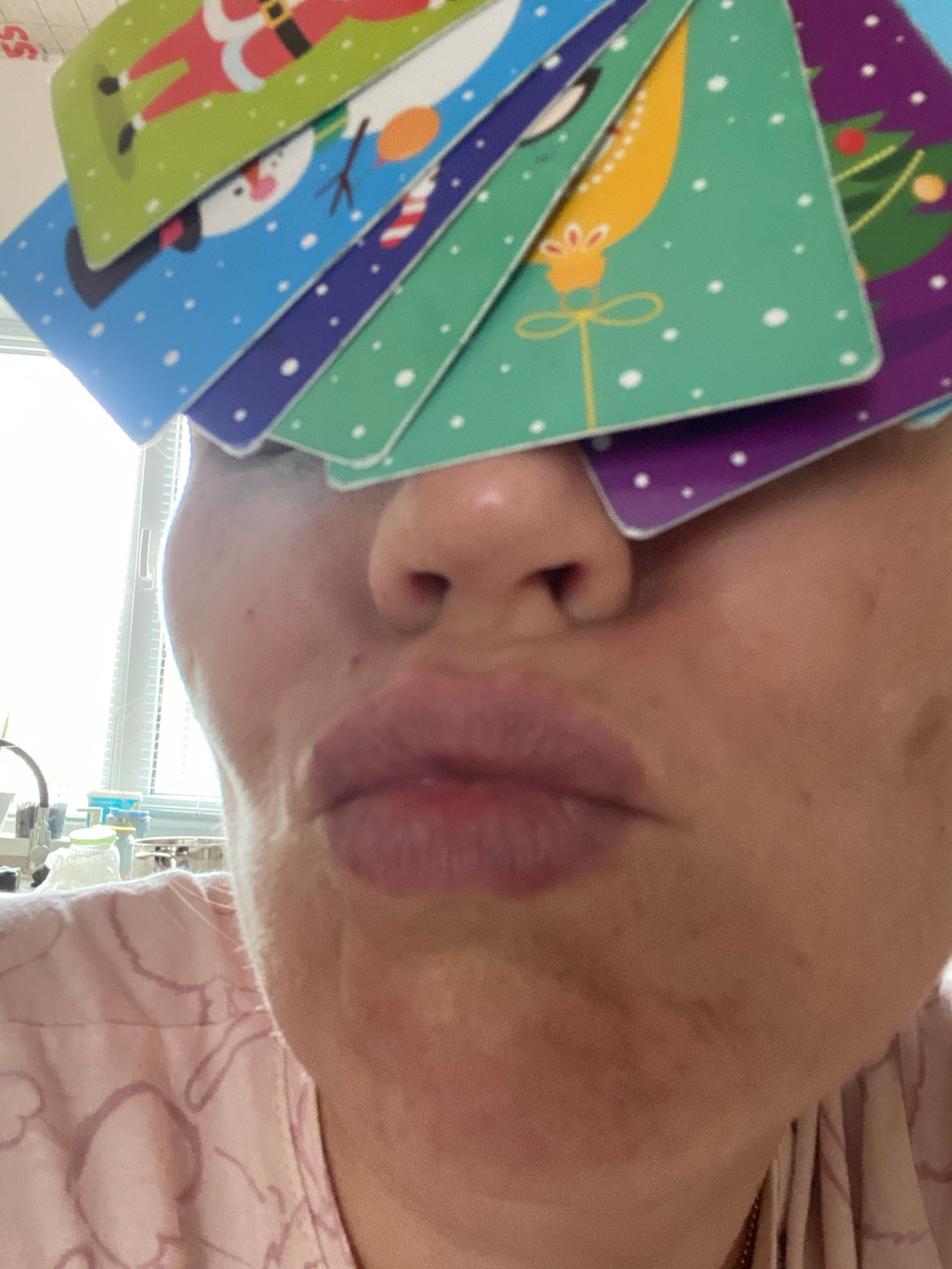 An upward-facing close-up shot shows a person's face, partially obscured by a stack of Christmas-themed cards. The cards feature images of a Christmas tree, a gold ornament, Santa Claus, and a snowman…read more