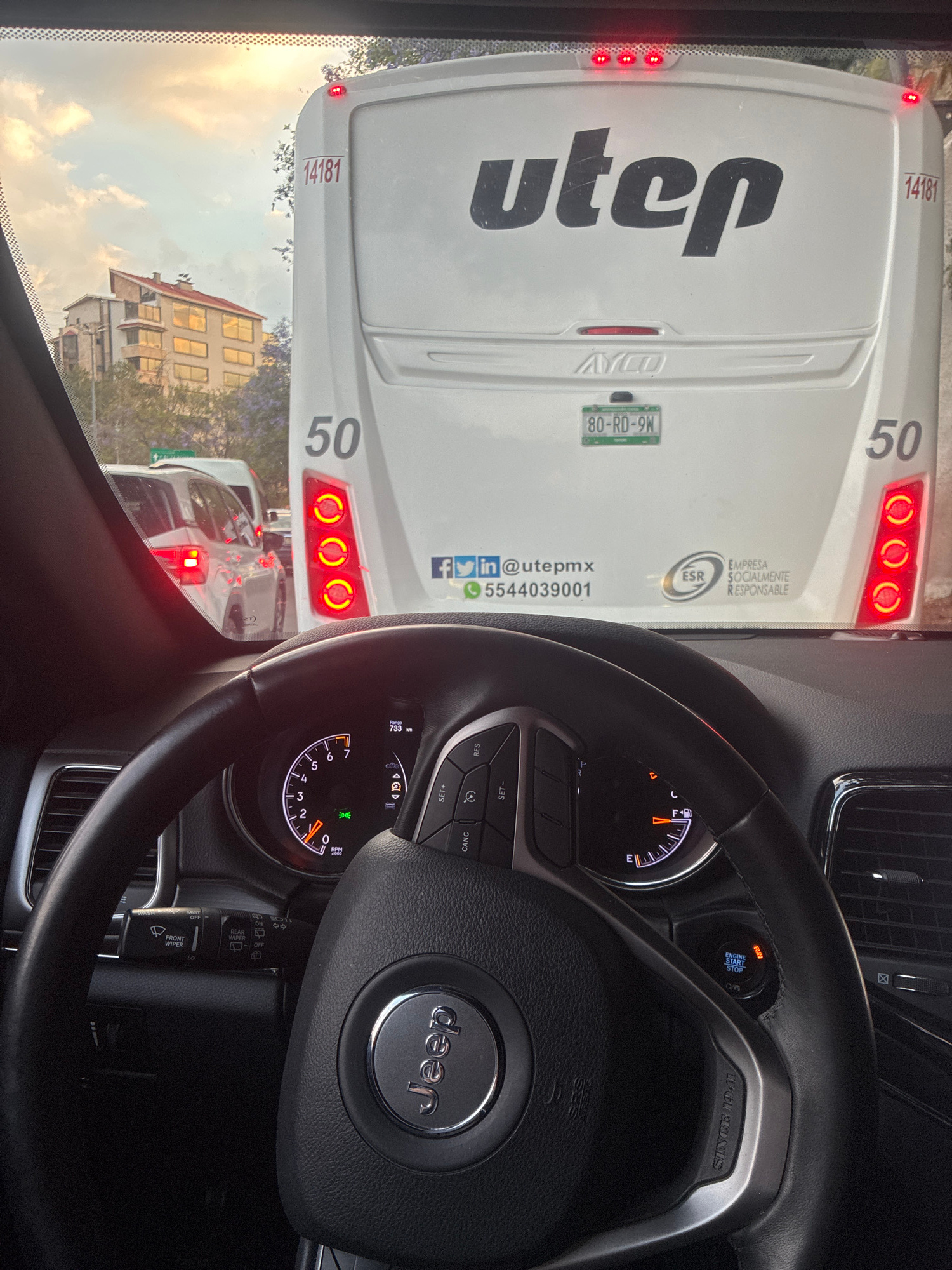 The view from the driver's seat of a Jeep shows a UTEP bus directly in front. The bus, numbered 50 and marked "14181," displays the license plate "80-RD-9N," social media contacts, and the logo of a s…read more