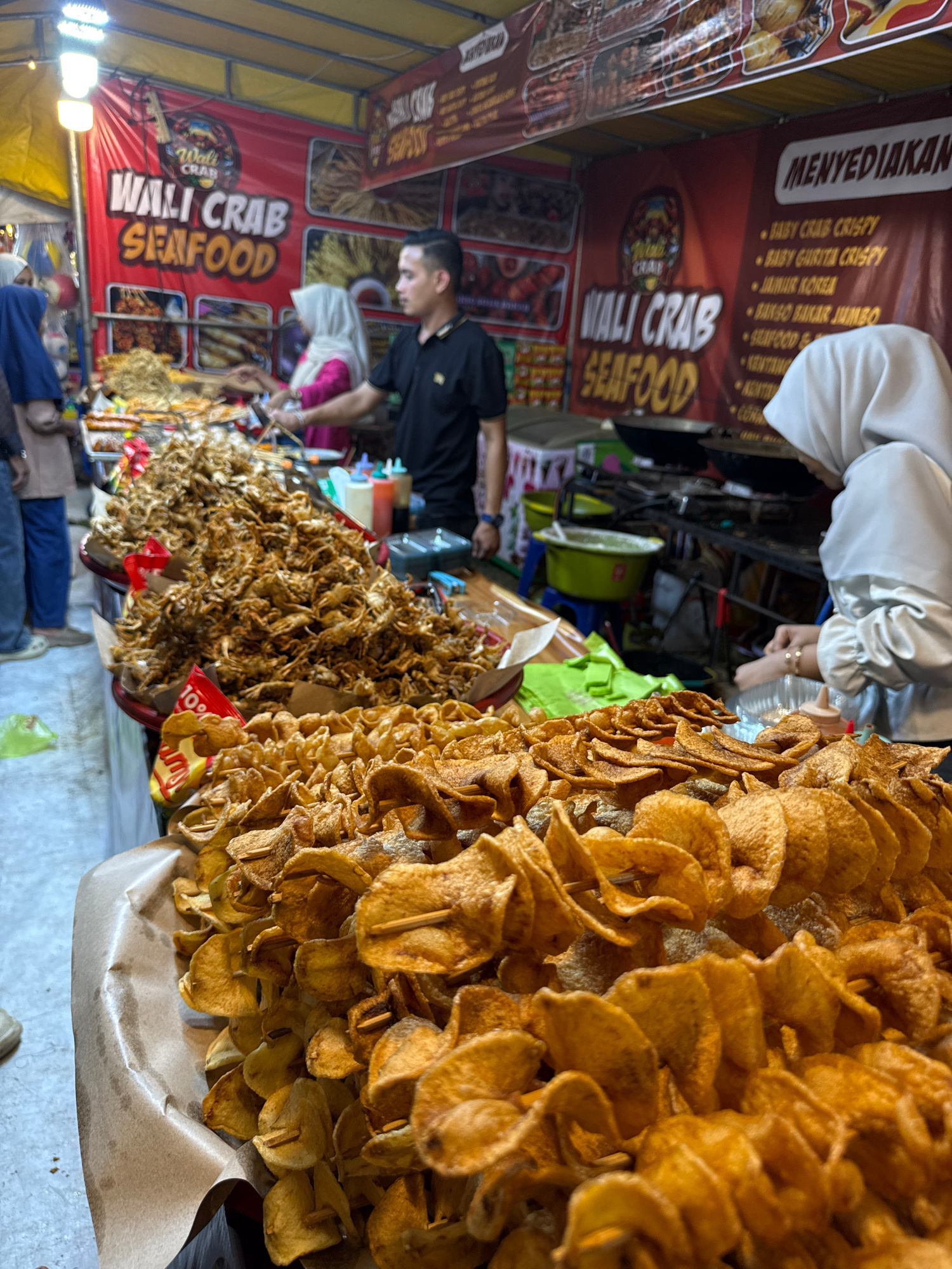 The image depicts a food stall in Geulumpangsulu Timu, Indonesia. The stall, named "Wali Crab Seafood," offers a variety of seafood dishes including baby crab crispy, baby gurita crispy, jabar korea,…read more
