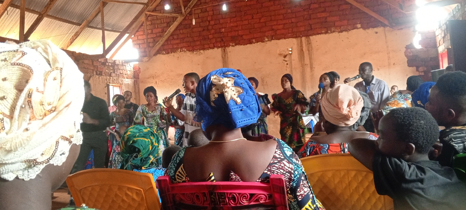 A daytime indoor shot shows a gathering of people in Ngalula, Democratic Republic of the Congo, likely a church service, judging by the microphones and singing. In the foreground, several people are s…read more