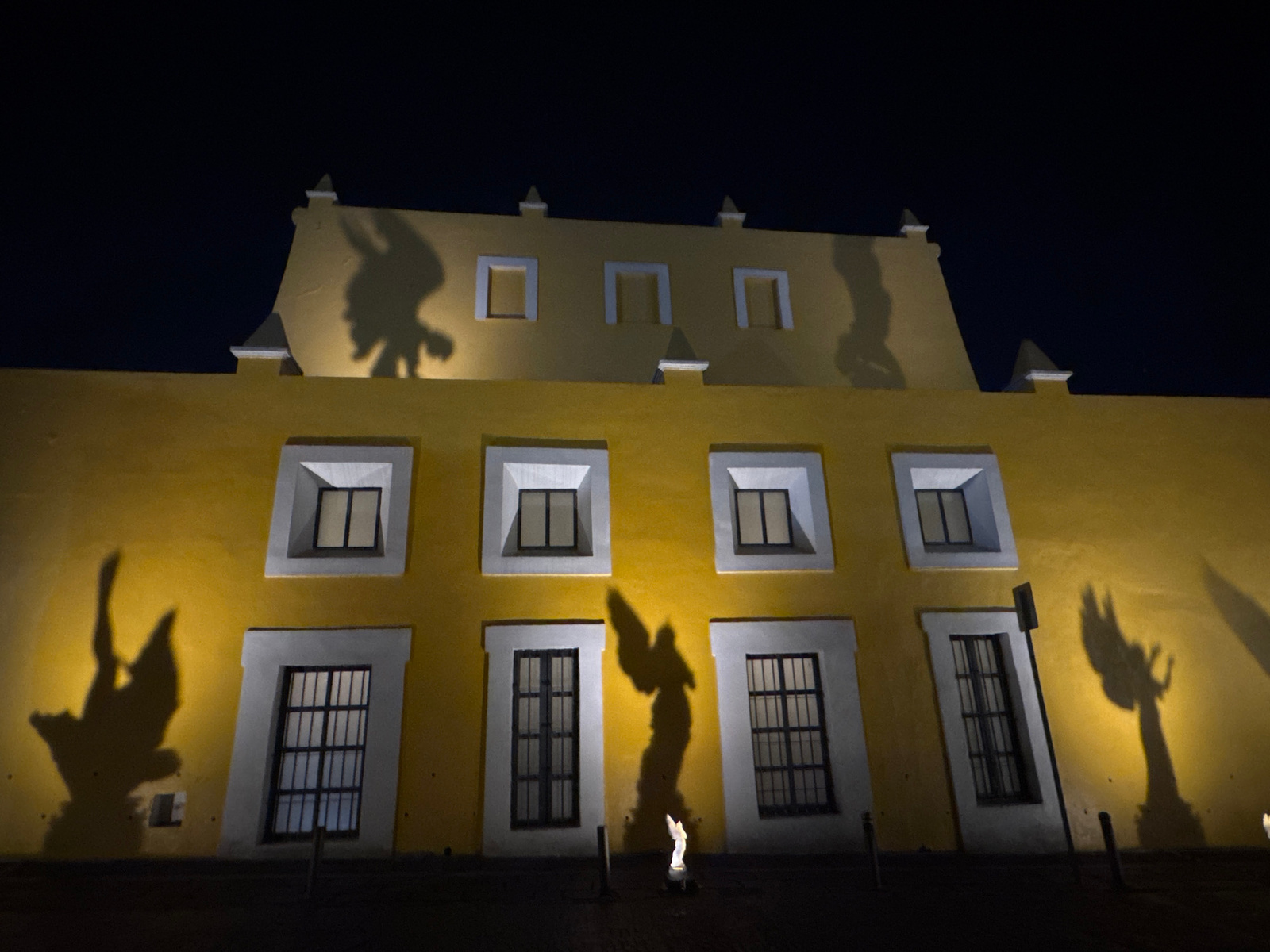 The image depicts a yellow building at night in the city of Puebla, Mexico. The building has a flat facade with rows of windows and rectangular decorative elements on the roof. Shadows of figures with…read more