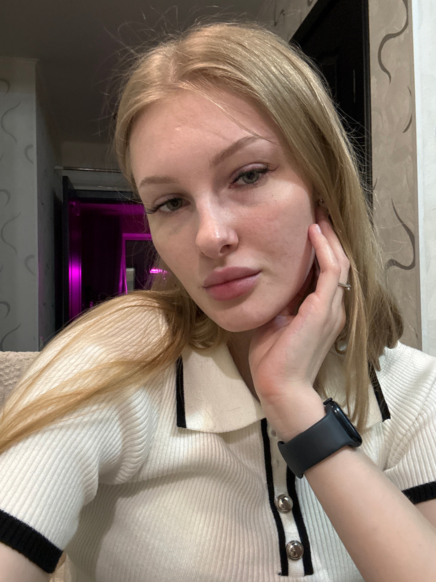 A fair-skinned young woman with blond hair is seen in a close-up shot, likely a selfie. She has green eyes and pink lips. Her right hand is near her face. A black smartwatch is on her left wrist. Sheβ¦read more
