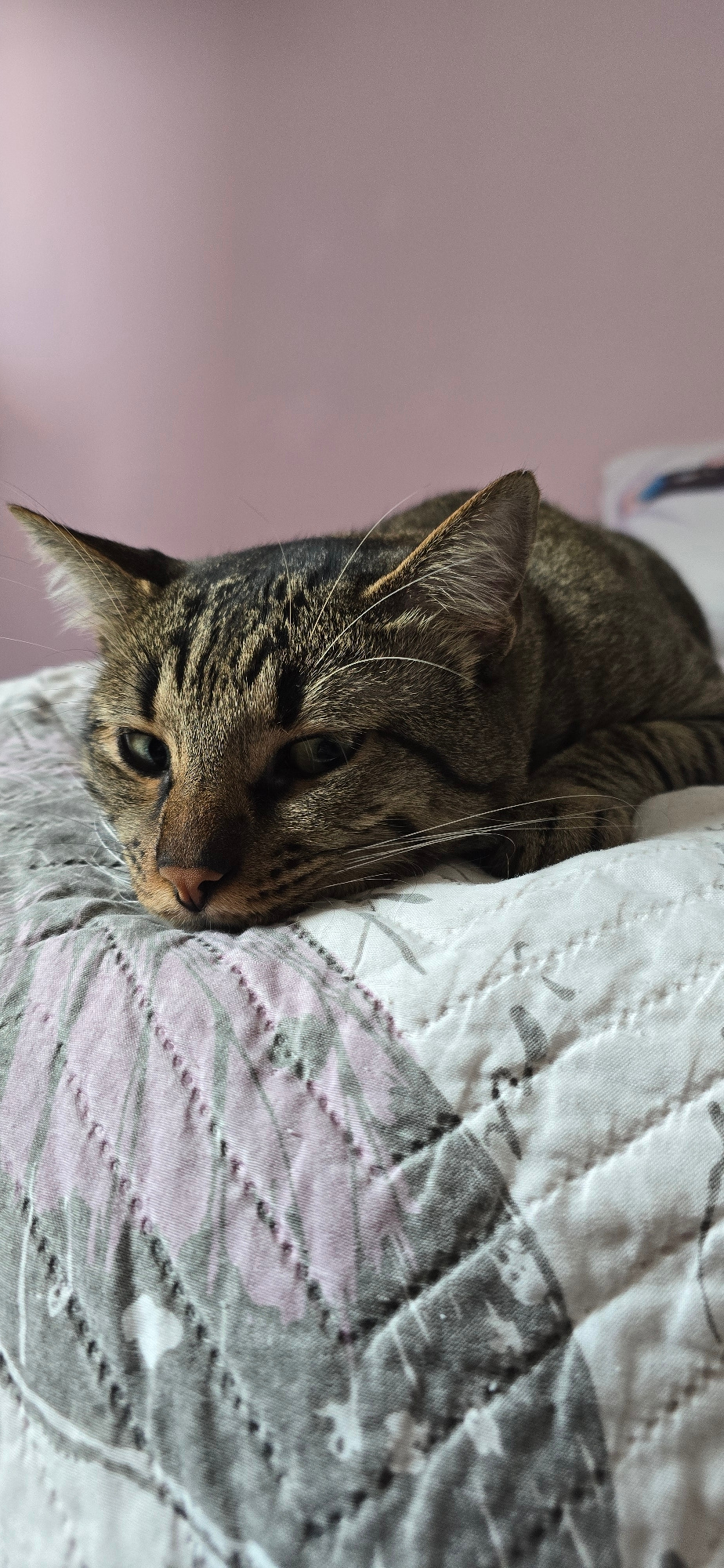 A close-up, eye-level shot captures a tabby cat nestled comfortably in an indoor setting in Burgas, Bulgaria. The cat, predominantly brown with distinct black stripes across its fur, is seen with its…read more