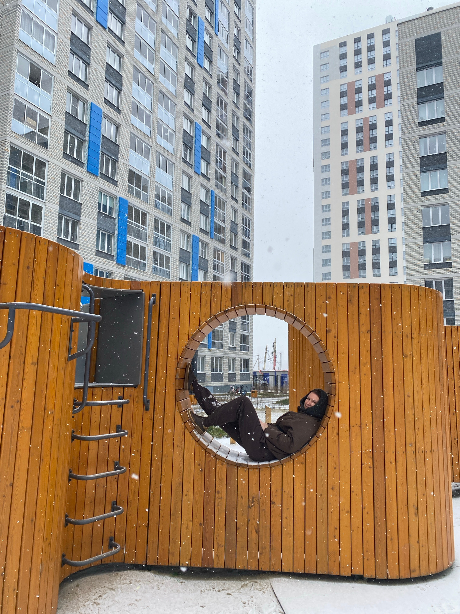 A person is seated within a circular window in a wooden structure, likely a piece of street furniture. They are wearing a dark hooded jacket and dark pants, and their legs extend through the circular…read more