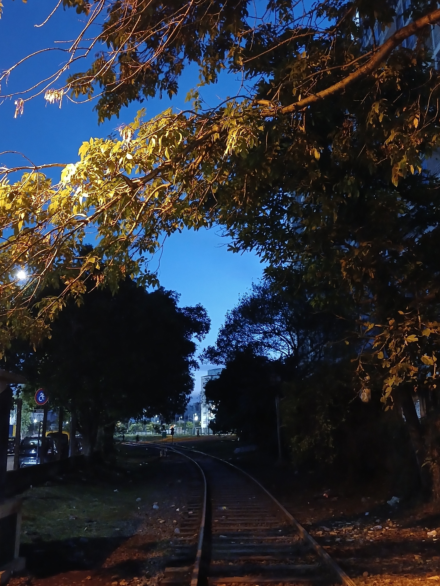 A low-angle, rotated view looking upward through the branches of trees towards a blue sky, showing a night scene in what appears to be a park in Buenos Aires, Argentina. On the right is a curved metal…read more