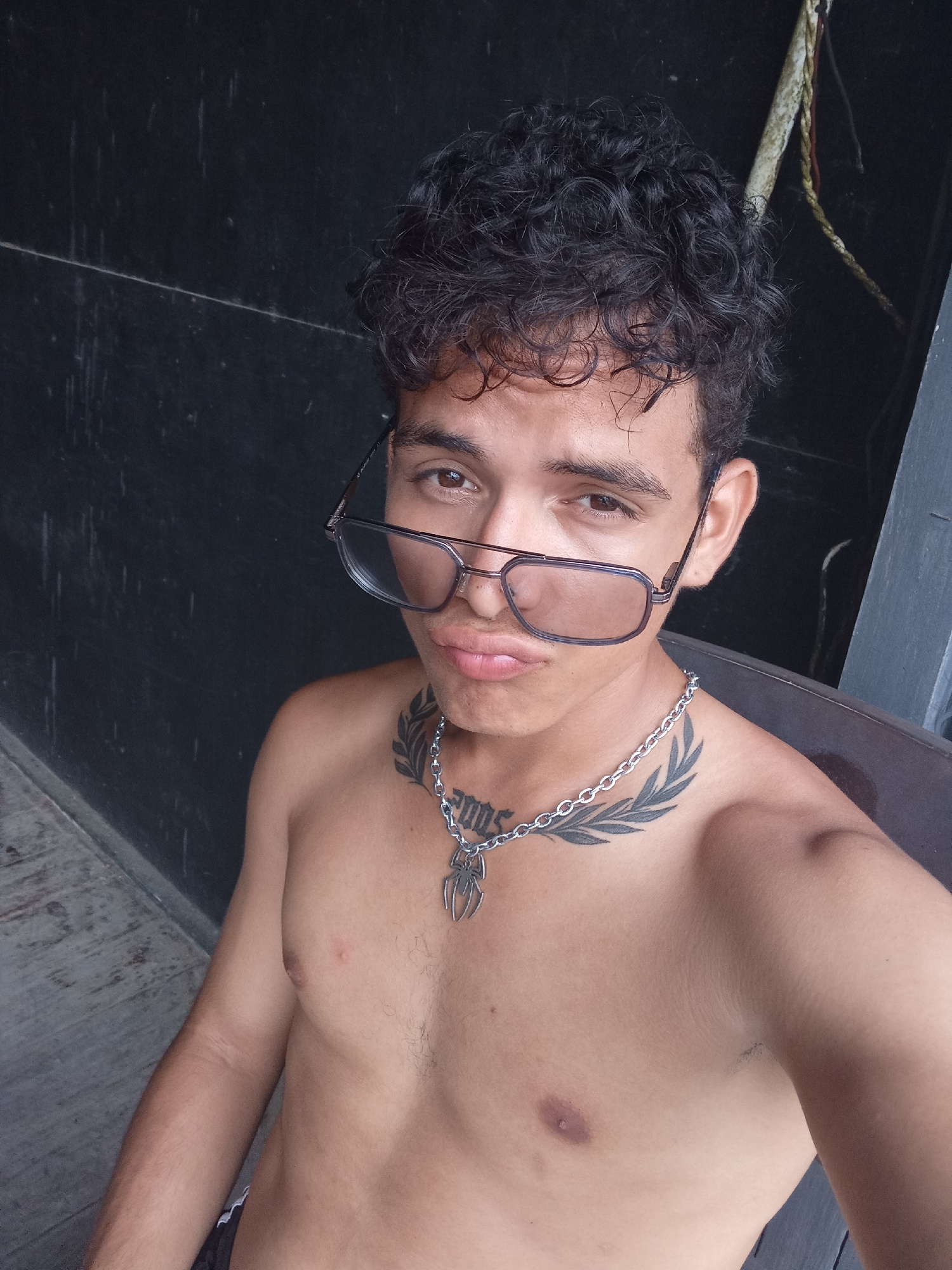 A young, shirtless individual with curly dark hair and brown eyes poses for a selfie. They are wearing glasses with rectangular frames, a silver chain necklace with a pendant, and have tattoos on thei…read more