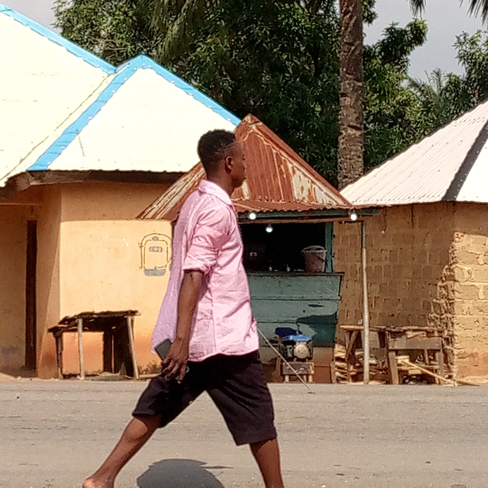 The image depicts a man walking barefoot on an asphalt surface in what appears to be Mararaba, Nigeria. The man is wearing a light pink, button-down shirt and dark shorts. He is walking from left to r…read more