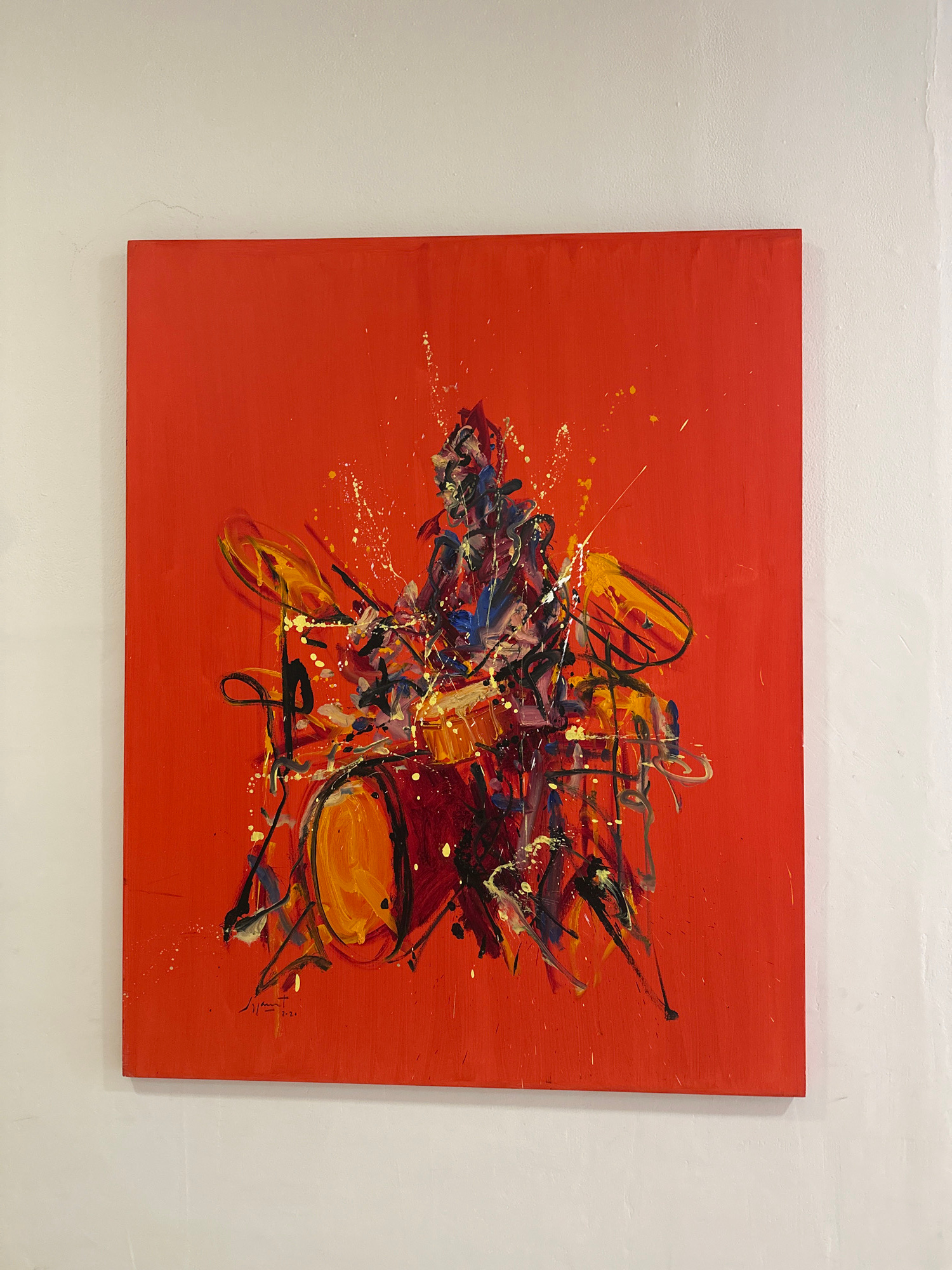 The image shows an abstract painting on a square canvas hanging on a white wall. The painting features a vibrant red background with chaotic strokes and splashes of color including yellow, black, blue…read more