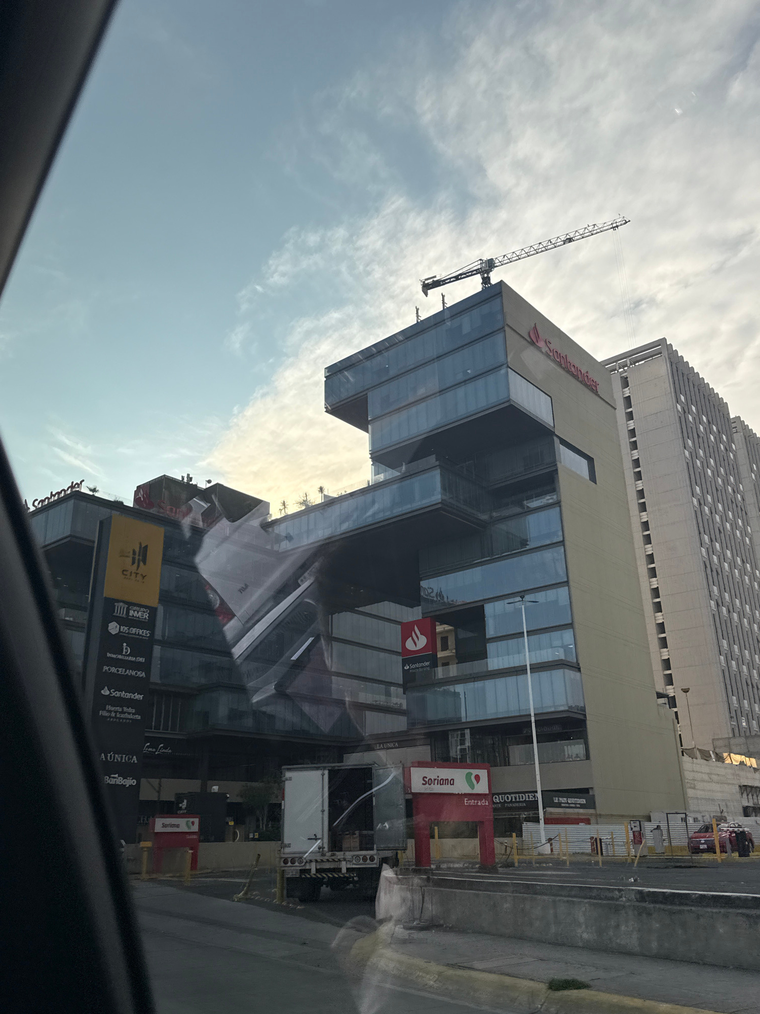 The photograph captures a view of a commercial complex in Heroica Puebla de Zaragoza, Mexico. The architecture is modern, incorporating glass and steel in its design. Prominent signage indicates that…read more