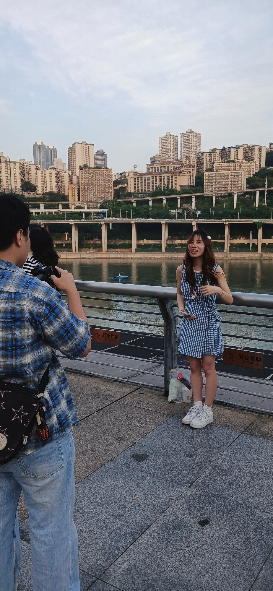 The image depicts a scene in 江北城街道, China, where a person is photographing a young woman posing by a railing. The woman is wearing a blue and white checkered dress and white sneakers. She is smiling a…read more