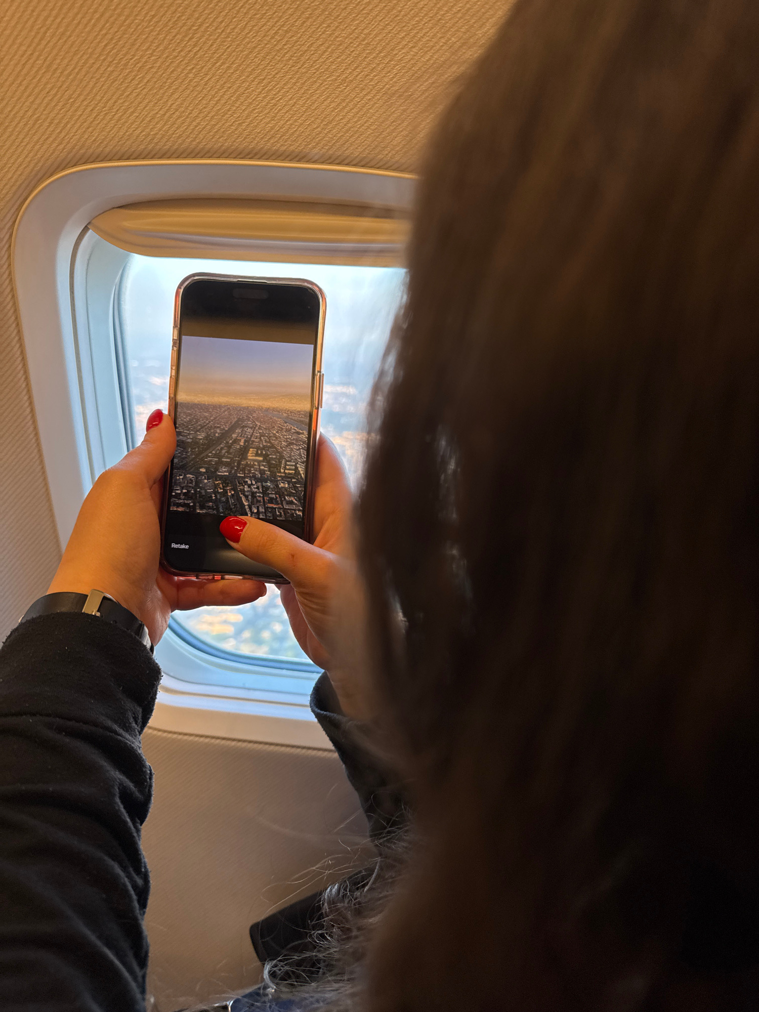 A passenger on an airplane holds a smartphone in front of a window, taking a photograph of the landscape outside. The phone's screen displays the image of a densely built urban area, likely a city, be…read more