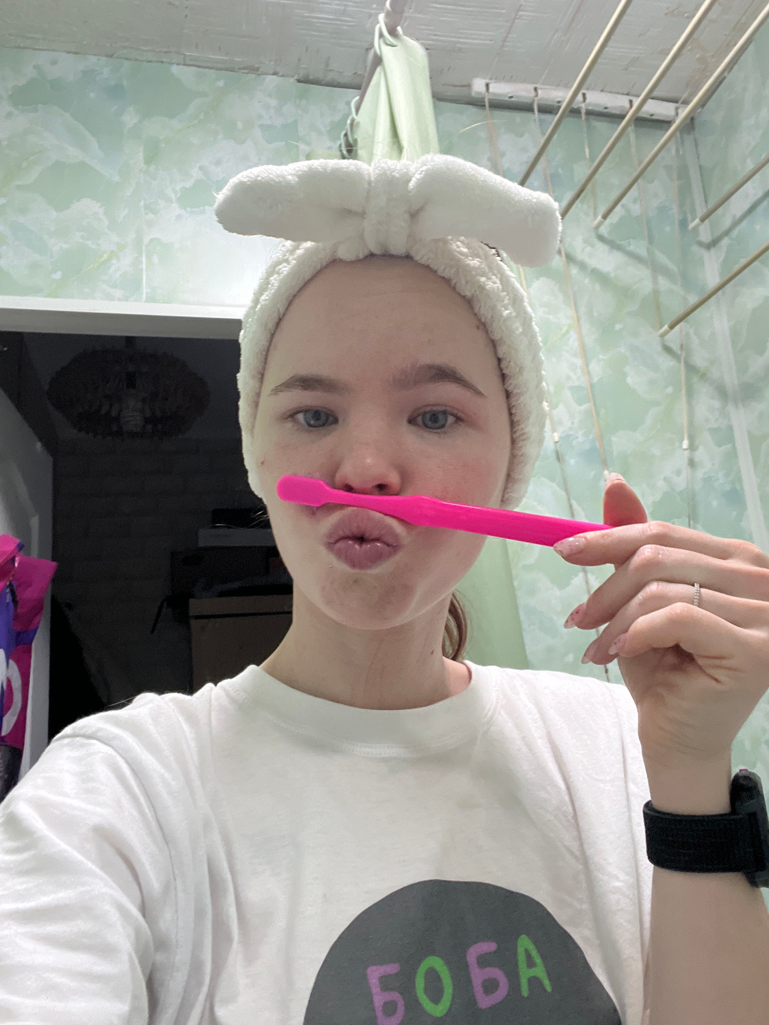 A woman with fair skin, light brown hair and blue eyes wears a white, plush headband with a bow. She holds a pink utensil vertically to her lips, puckering her mouth. She wears a white t-shirt with a…read more