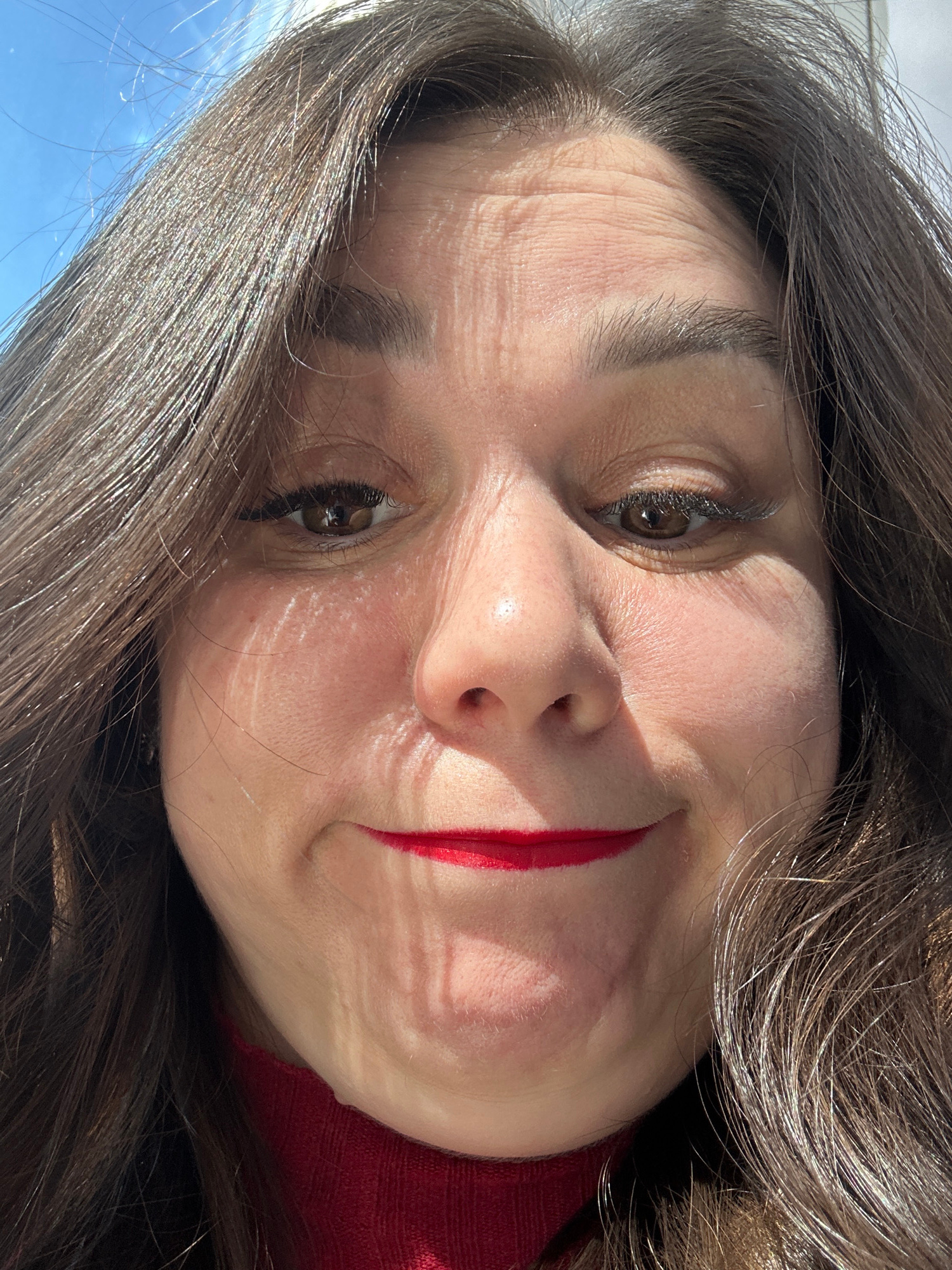 A close-up, slightly angled portrait of a middle-aged woman with brown hair and eyes is captured in bright, direct sunlight. The woman wears red lipstick and a red top is visible near the edge of the…read more