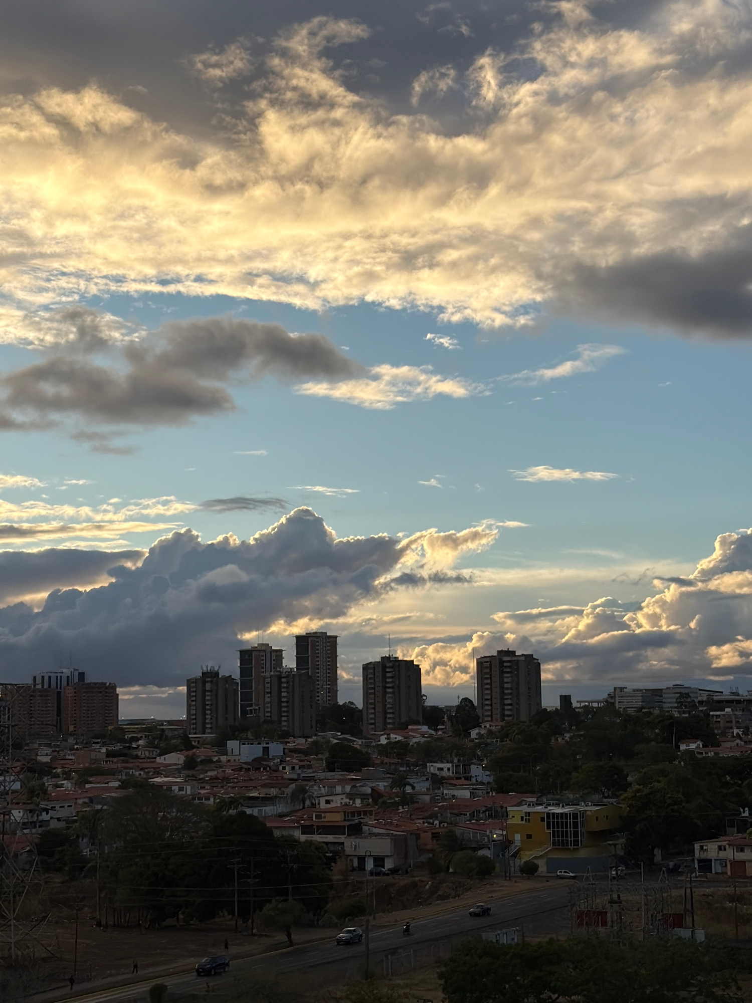 An elevated panoramic view depicts a cityscape in Ciudad Guayana, Venezuela, at an estimated late afternoon or early evening, characterized by dramatic cloud formations and indirect sunlight. The uppe…read more