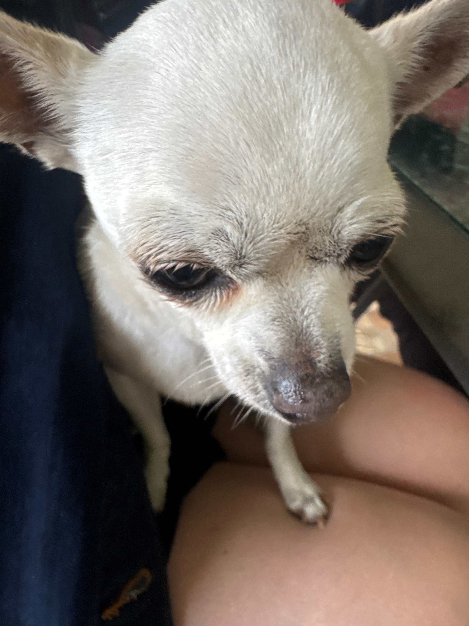 A close-up image shows a small, white Chihuahua dog resting on someone's lap, with the dog's head facing the viewer. The dog's face and head are prominent, with a textured, slightly wrinkled nose and…read more