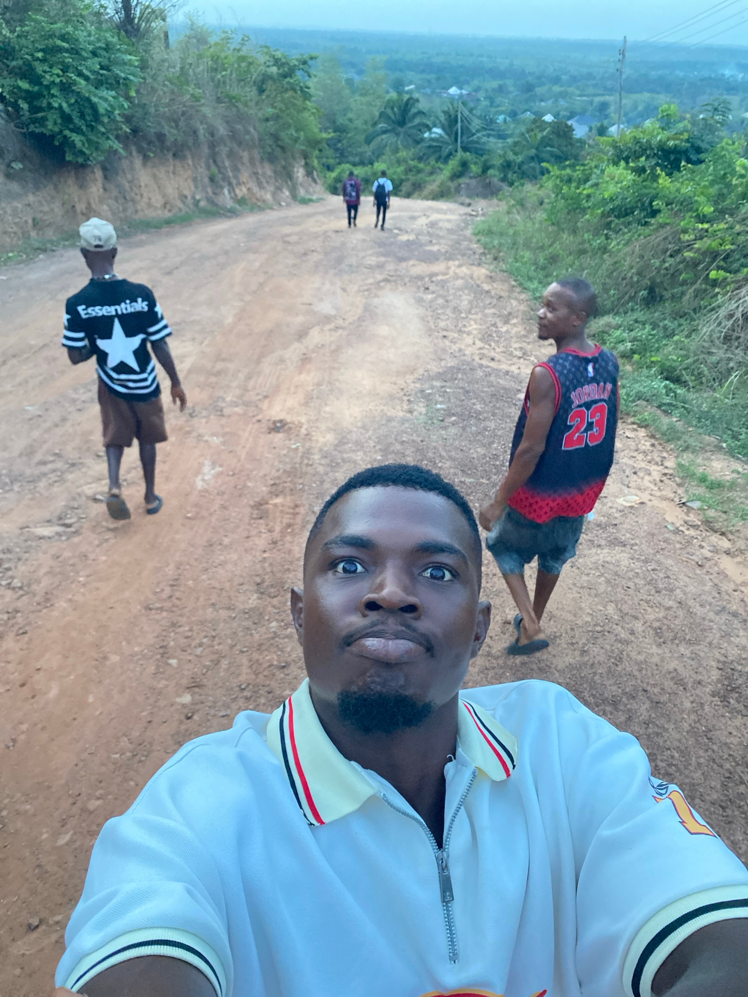 The image shows a dirt road in Achara, Nigeria, populated by four people. The foreground features a close-up selfie of a man with a short haircut and beard, wearing a white zippered shirt with a black…read more