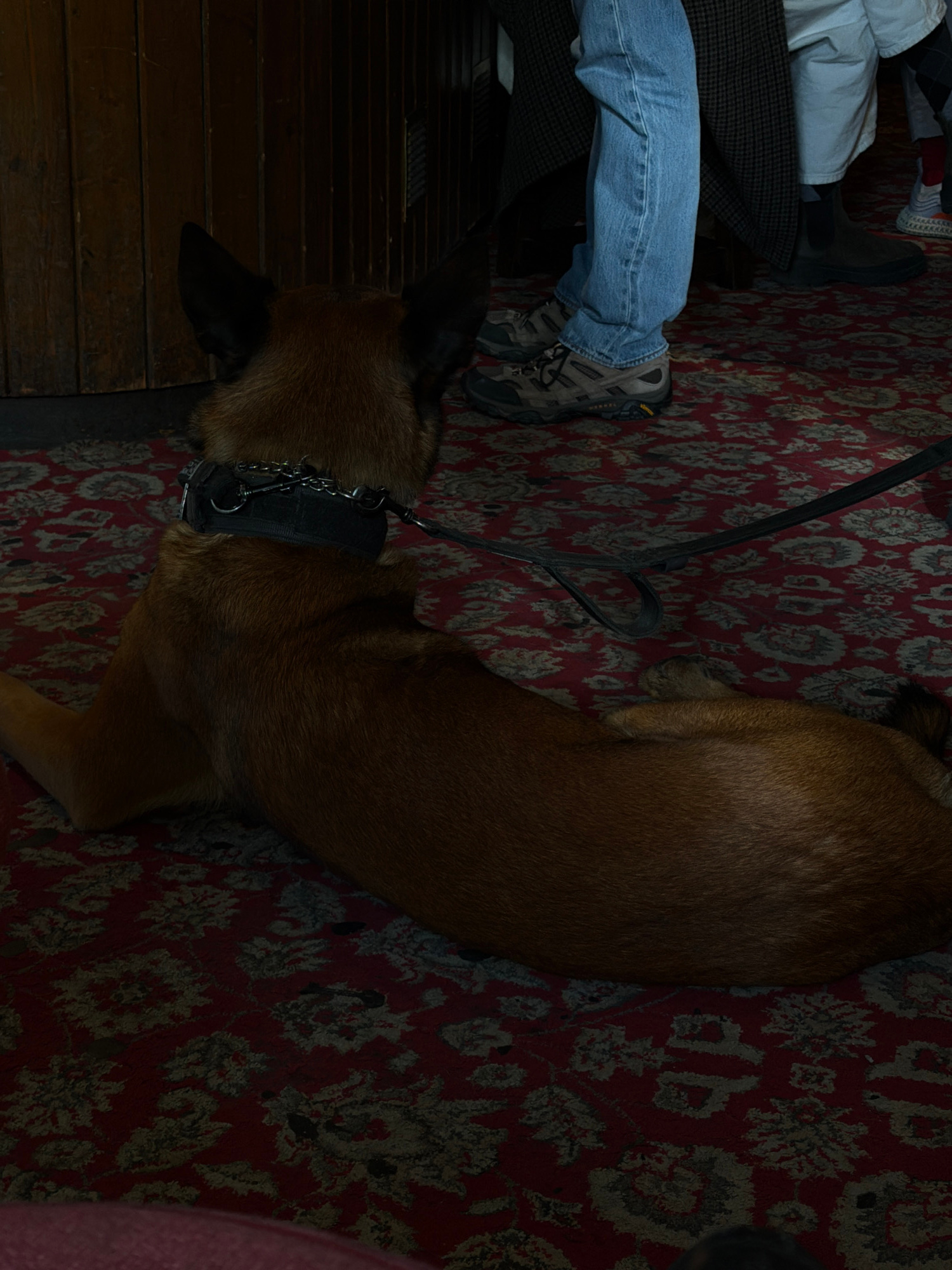 A high-angle shot depicts a brown dog with a black collar and leash resting on a red and beige patterned carpet. A person wearing blue jeans and hiking boots sits adjacent to the dog, with the edge of…read more