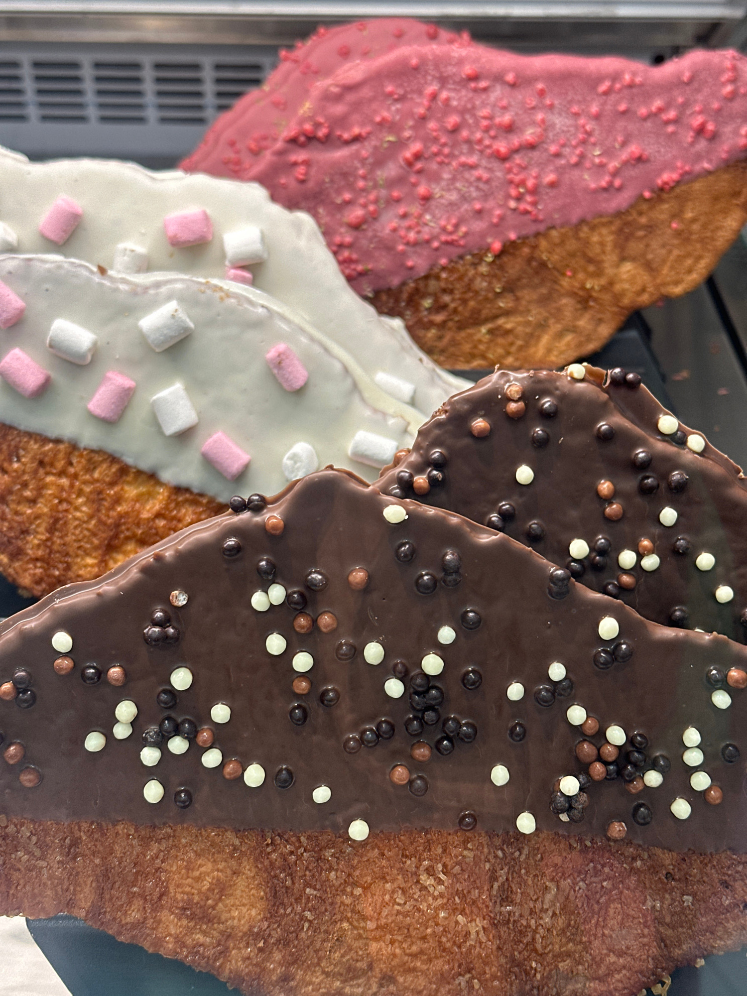 The image shows a close-up view of several churros variations on display, likely in a pastry shop or cafe. Each churro has a different topping or coating on one half, including pink with sprinkles, wh…read more