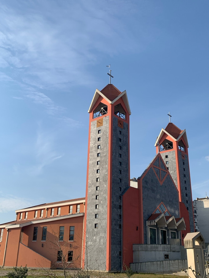 The image displays the Catholic Church of Saint Peter the Apostle (Katedrala Svetog Petra Apostola) located in Bar, Montenegro. The modern ecclesiastical building features a dominant architectural sty…read more