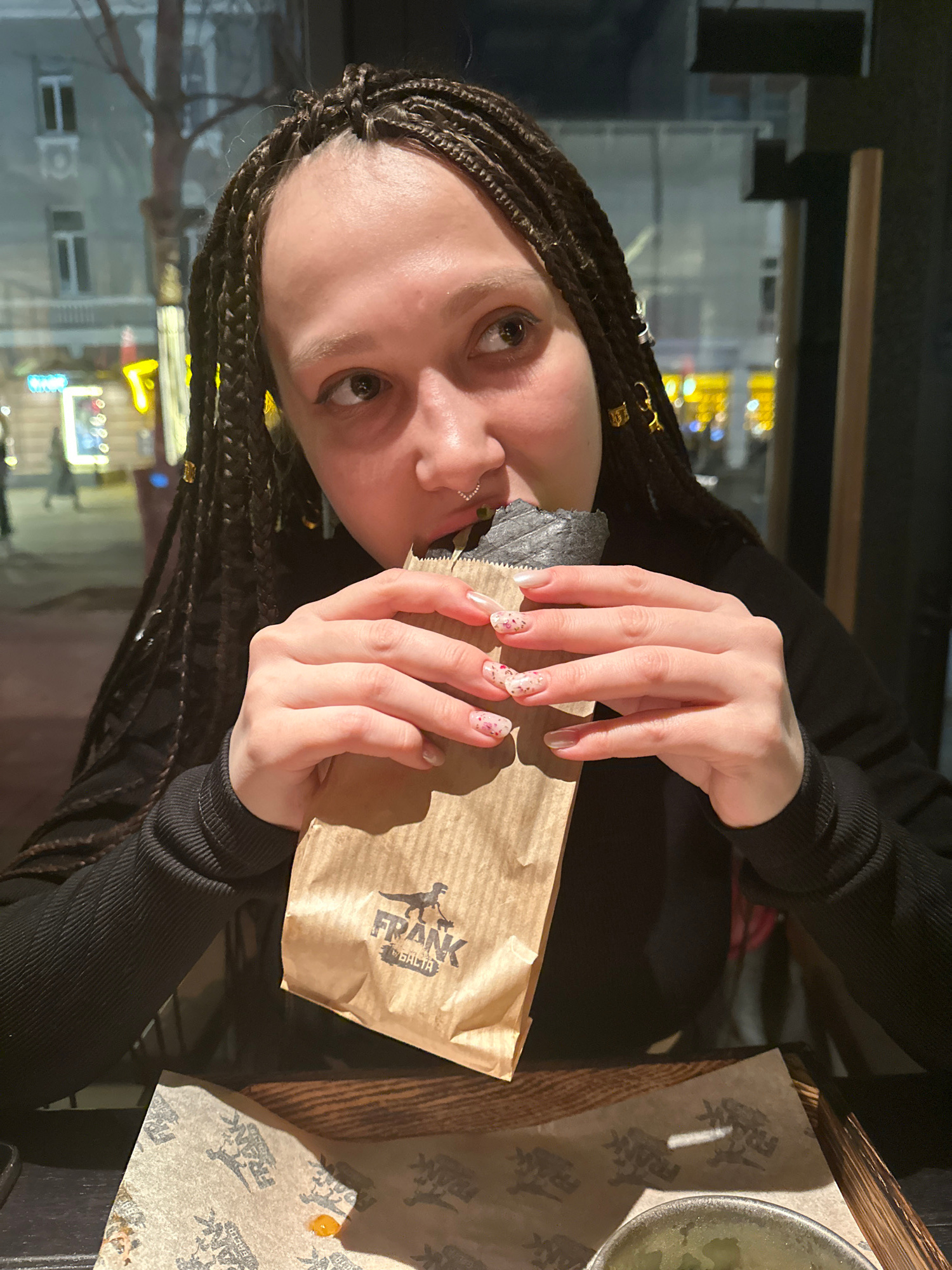 A woman with braided hair and decorative golden accessories in her braids holds a brown paper bag labeled "FRANK БЛЧТА" in her hands, with a restaurant-branded placemat visible on the table. A bowl of…read more