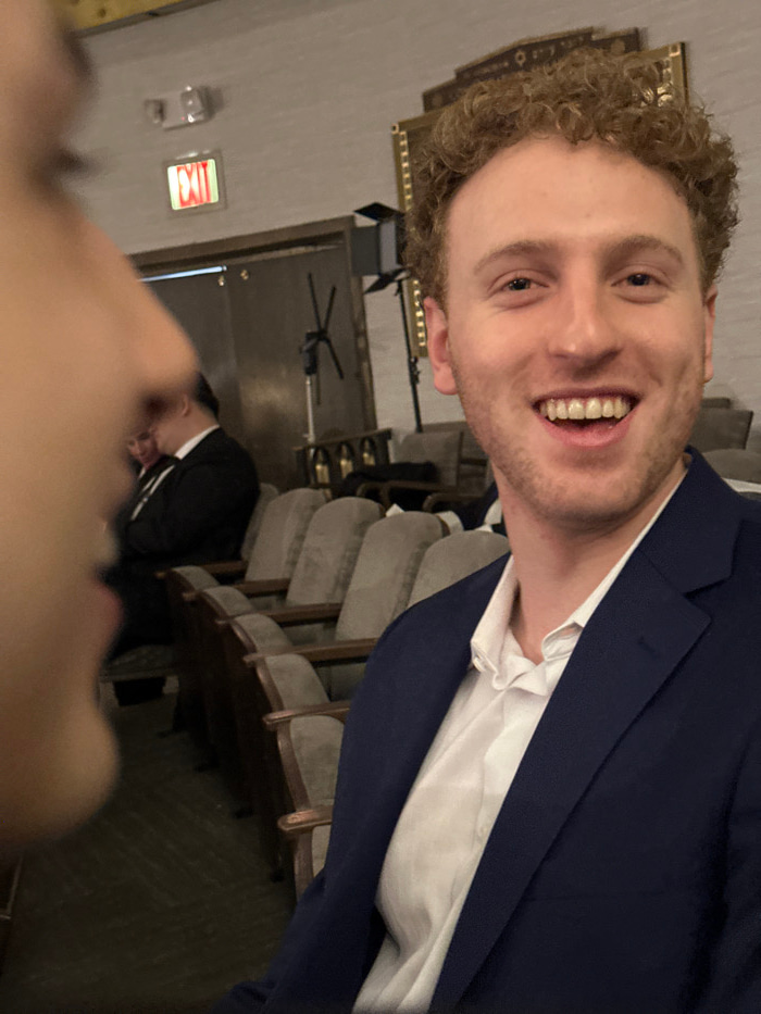 A man with curly blonde hair wearing a navy blue suit and a white shirt smiles towards the camera. He is standing in what appears to be a theatre or auditorium, as indicated by the rows of empty seats…read more