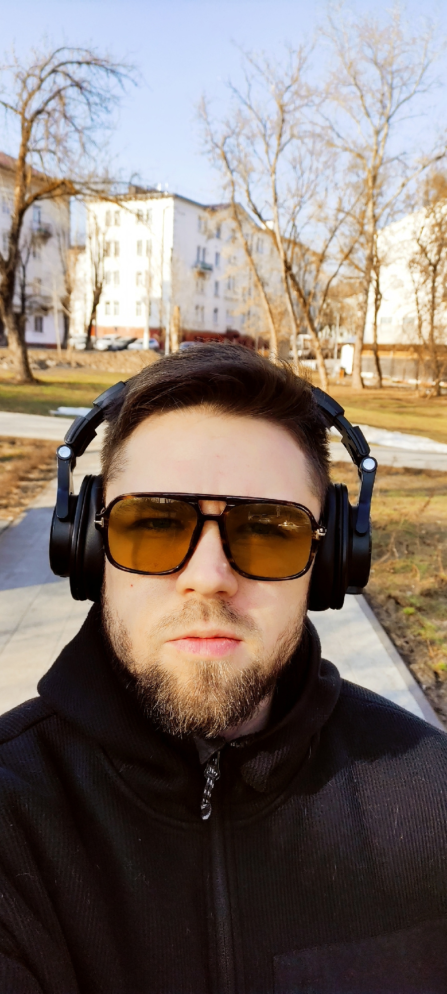 A man is taking a selfie outdoors. He wears sunglasses and black headphones, with a black jacket zipped up near the collar. The background shows trees and buildings, indicative of an urban setting. It…read more