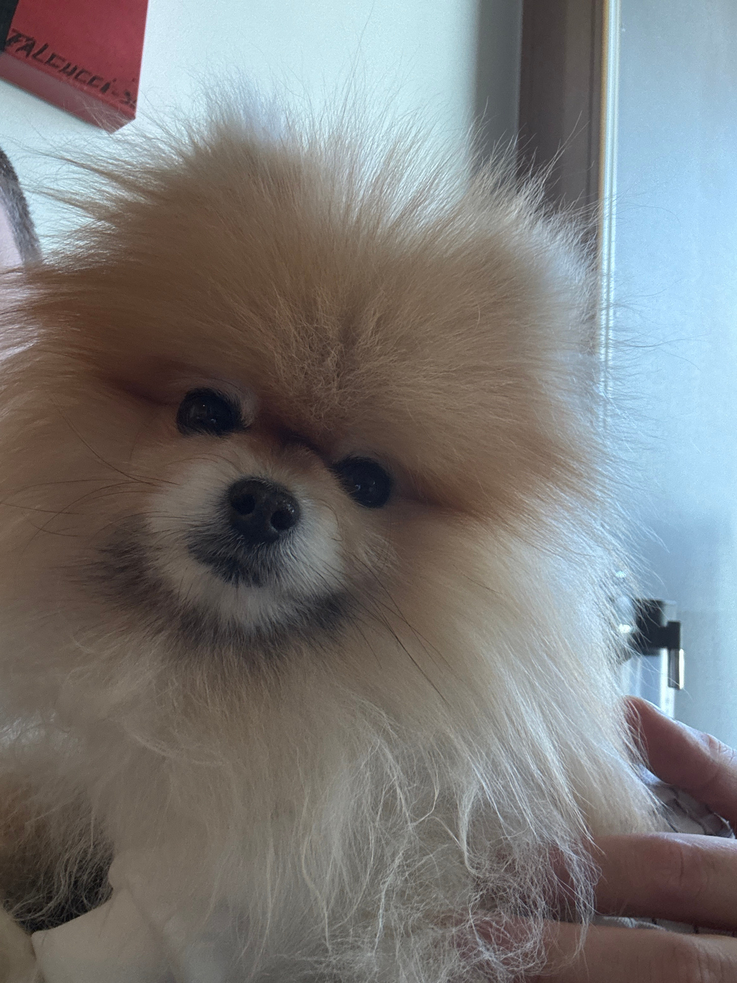 A close-up, eye-level photograph captures a small, fluffy Pomeranian dog, centrally positioned and looking directly towards the viewer. The dog is predominantly light brown to cream-colored, with prof…read more