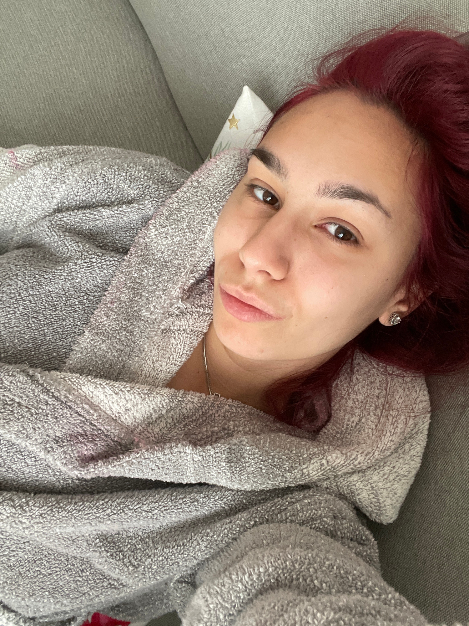 A woman with red hair is lying on a gray couch wearing a gray robe. Her head rests on a small, white pillow with a gold star. She has brown eyes and fair skin. She is wearing a small silver necklace a…read more