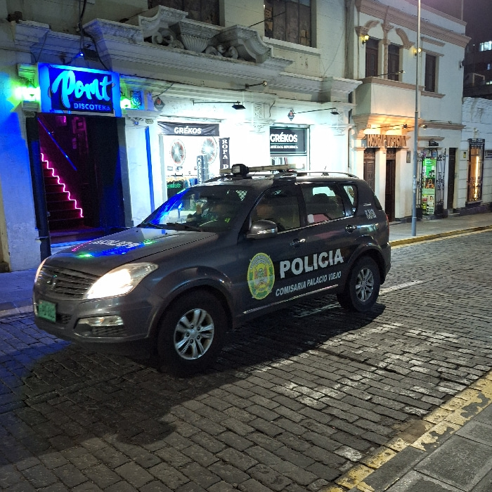 A Peruvian police car is parked on a cobblestone street next to a building with a nightclub called "Port Discoteca." The club's sign glows with blue light, and the entrance features pink neon. Banners…read more