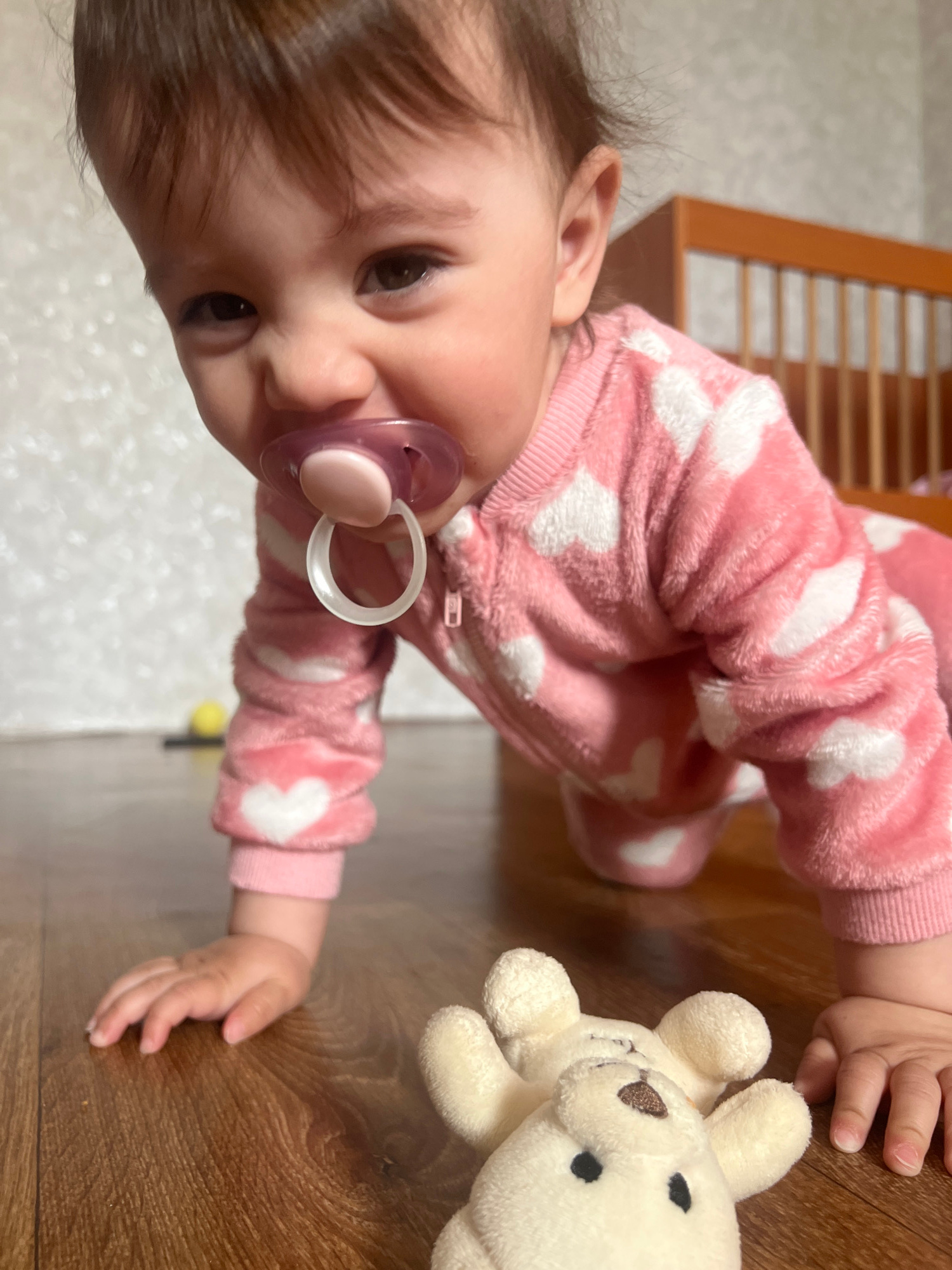 A baby wearing a pink and white hearts onesie is lying on a wooden floor with a white stuffed toy bear next to them. The baby has dark hair and eyes, and a pacifier in their mouth. The background incl…read more