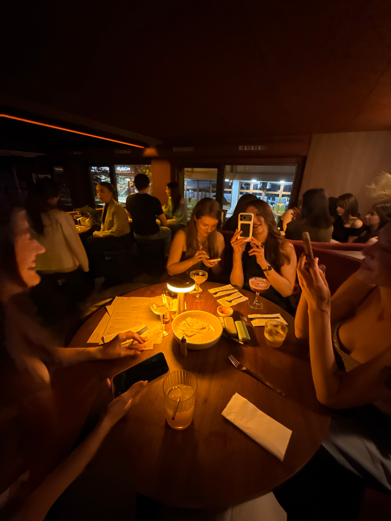 The image depicts a gathering of people at a restaurant or bar in Belgrade, Serbia. A group of individuals is seated around a dark-wood round table with plates of food, cocktails, menus, and phones on…read more