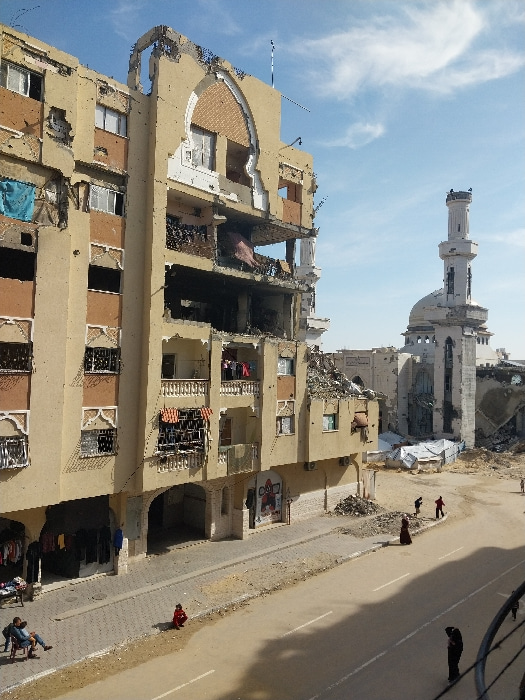 The image depicts an urban street scene in Khan Yunis, Palestinian Territory, characterized by extensive structural damage under a partly cloudy sky. In the left half of the frame, a multi-story, bei…read more