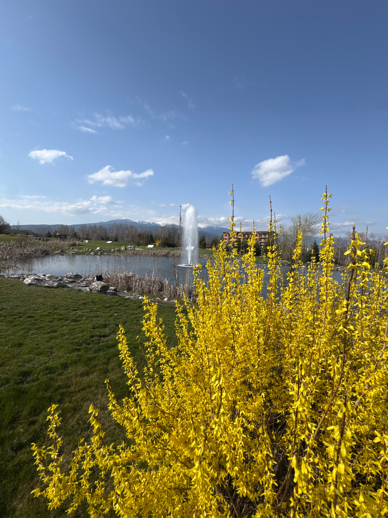 The image shows a vibrant landscape in Razlog, Bulgaria. A large bush with bright yellow flowers dominates the right side of the frame. To the left, there is a body of water, likely a lake or river, w…read more