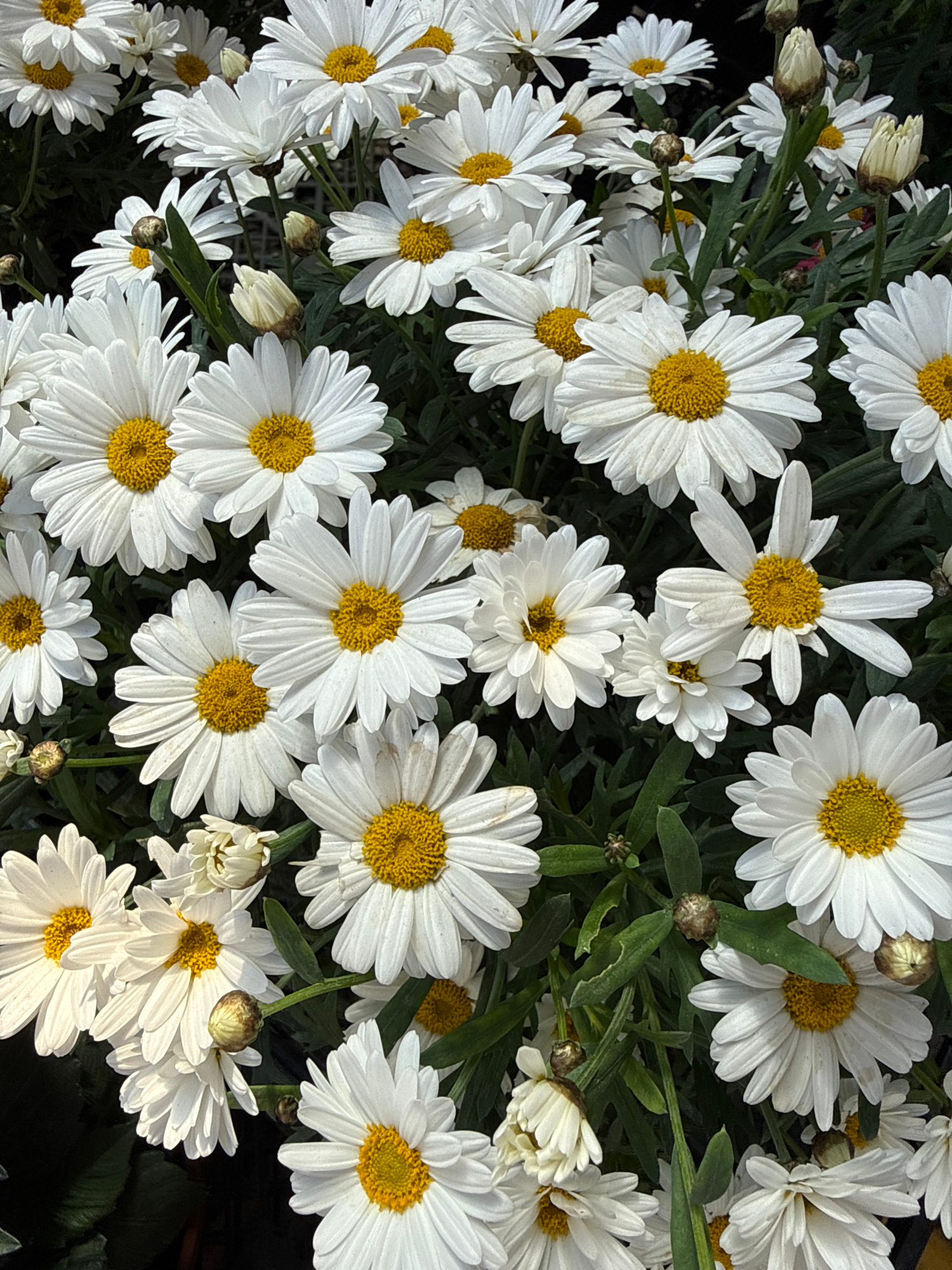 The image shows a dense cluster of white daisies with yellow centers. The daisies are in various stages of bloom, with some fully open and others still in bud. Green foliage is visible between the flo…read more