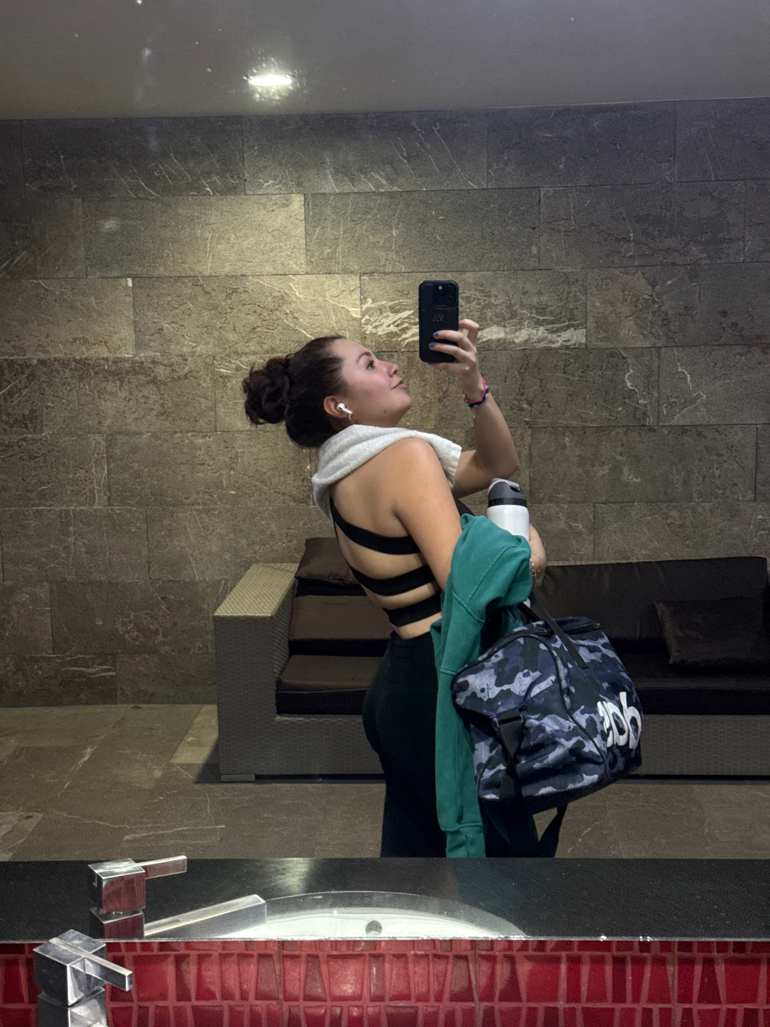 A young woman is standing in front of a mirror, holding a black smartphone in her left hand and looking at the screen. She is wearing a black sports bra with multiple straps across her back and a whit…read more