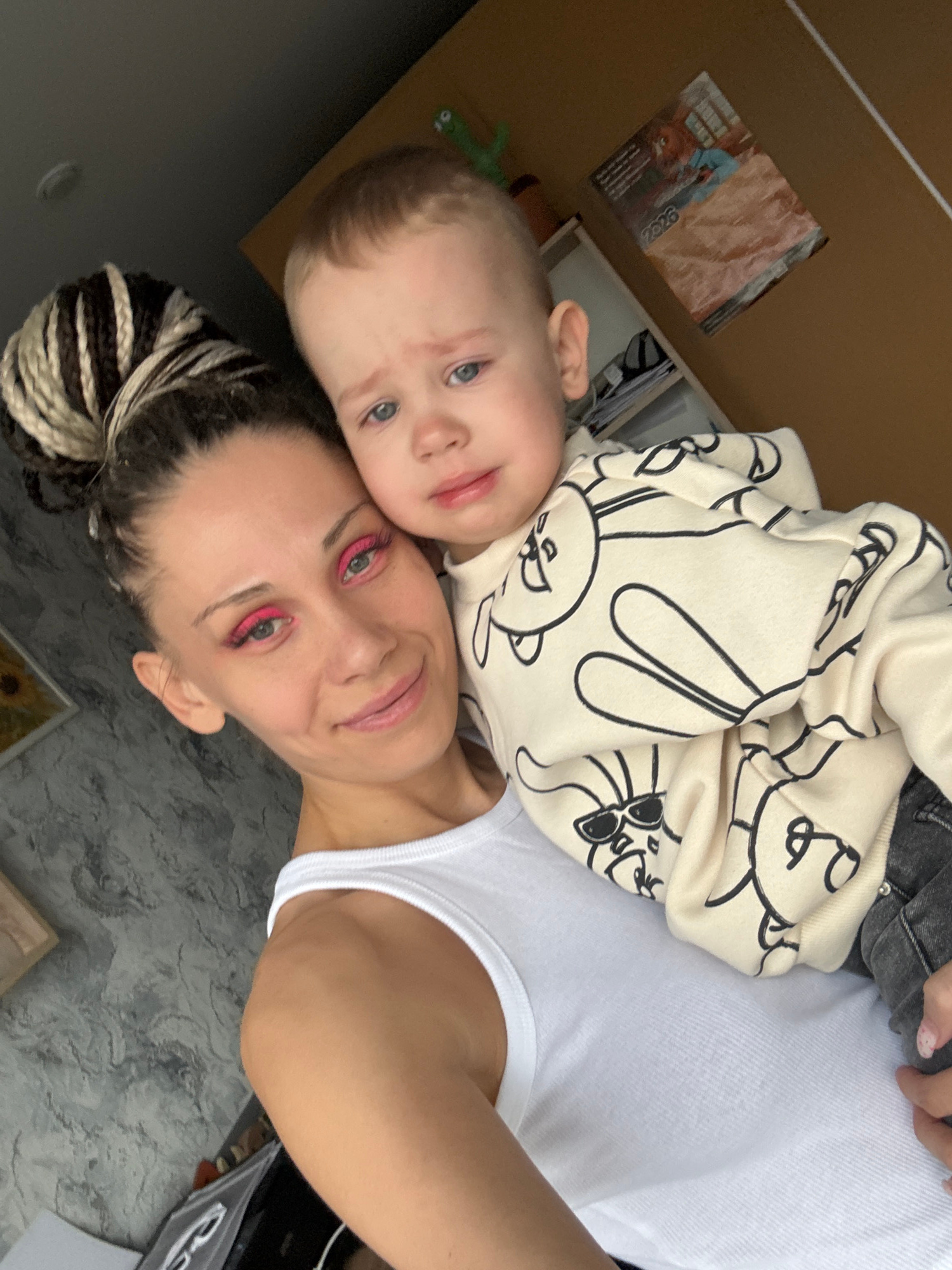 A selfie shot in Rusanovo, Russia, shows a light-skinned woman with dyed blonde and brown braids in a bun, lying on her back with a young child lying on top of her. The woman has pink eyeliner and lipβ¦read more