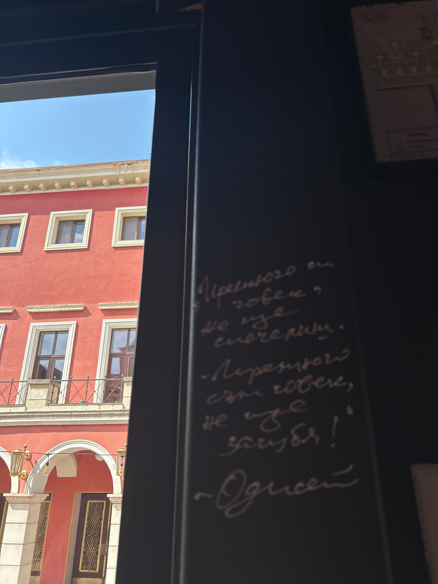The image captures an indoor perspective looking out a window, with a prominent black surface in the foreground featuring white handwritten text. Through the window, a vibrant red building with classi…read more
