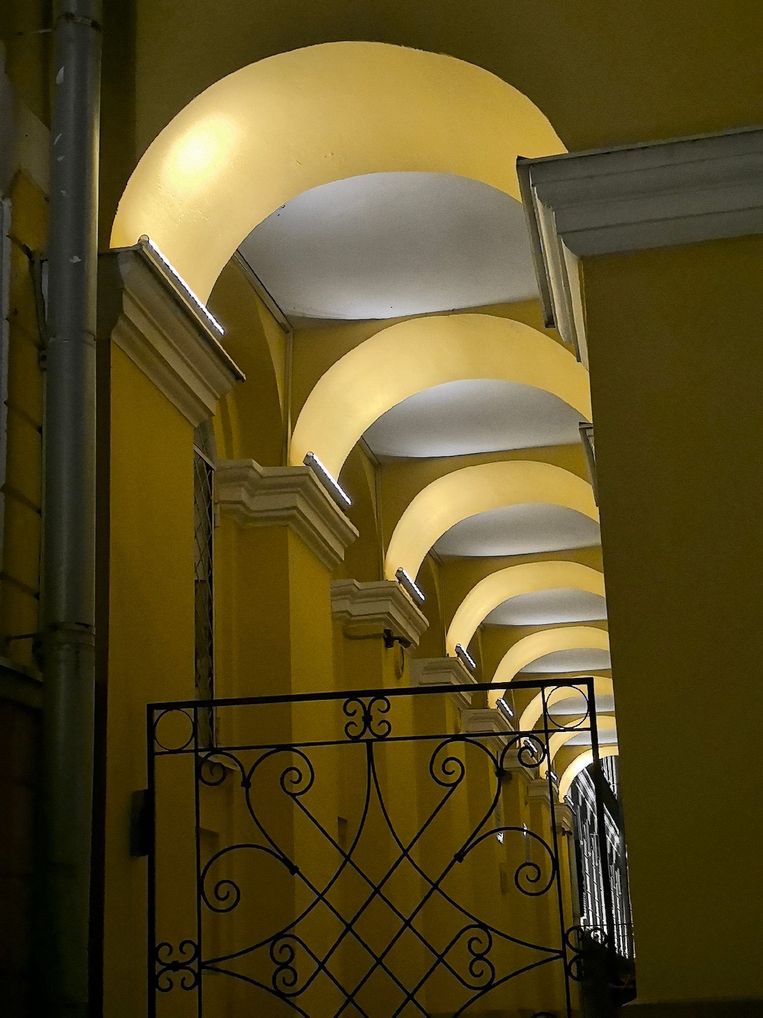 The image shows a row of illuminated arches forming a colonnade in what appears to be an exterior passageway. The arches are yellow on the outside and white on the inside, illuminated from above. Ther…read more
