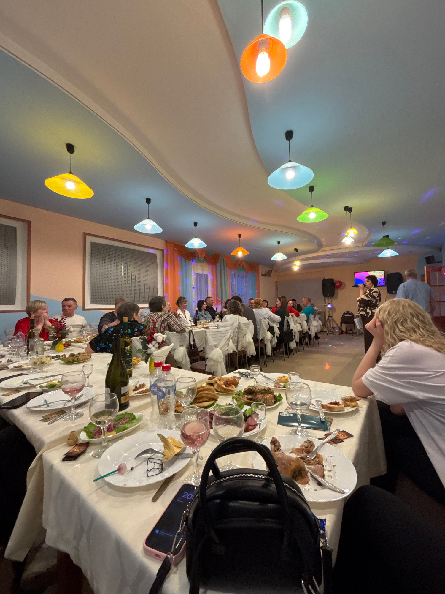 The image displays an indoor social gathering or banquet taking place in a hall located in the city of Foki, Russia. The room features light peach-colored walls, with two large, framed dark grey panelβ¦read more