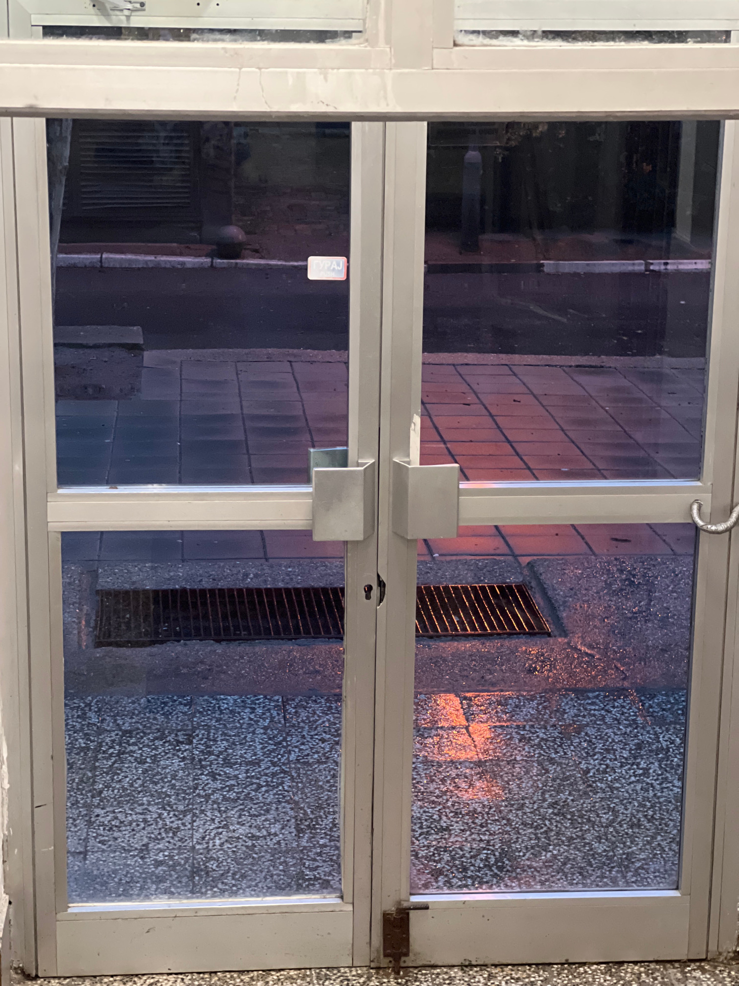 An interior view through a partially open, white-framed window reveals the exterior urban environment. The window is divided into four panes by a horizontal and vertical frame. The building exterior v…read more