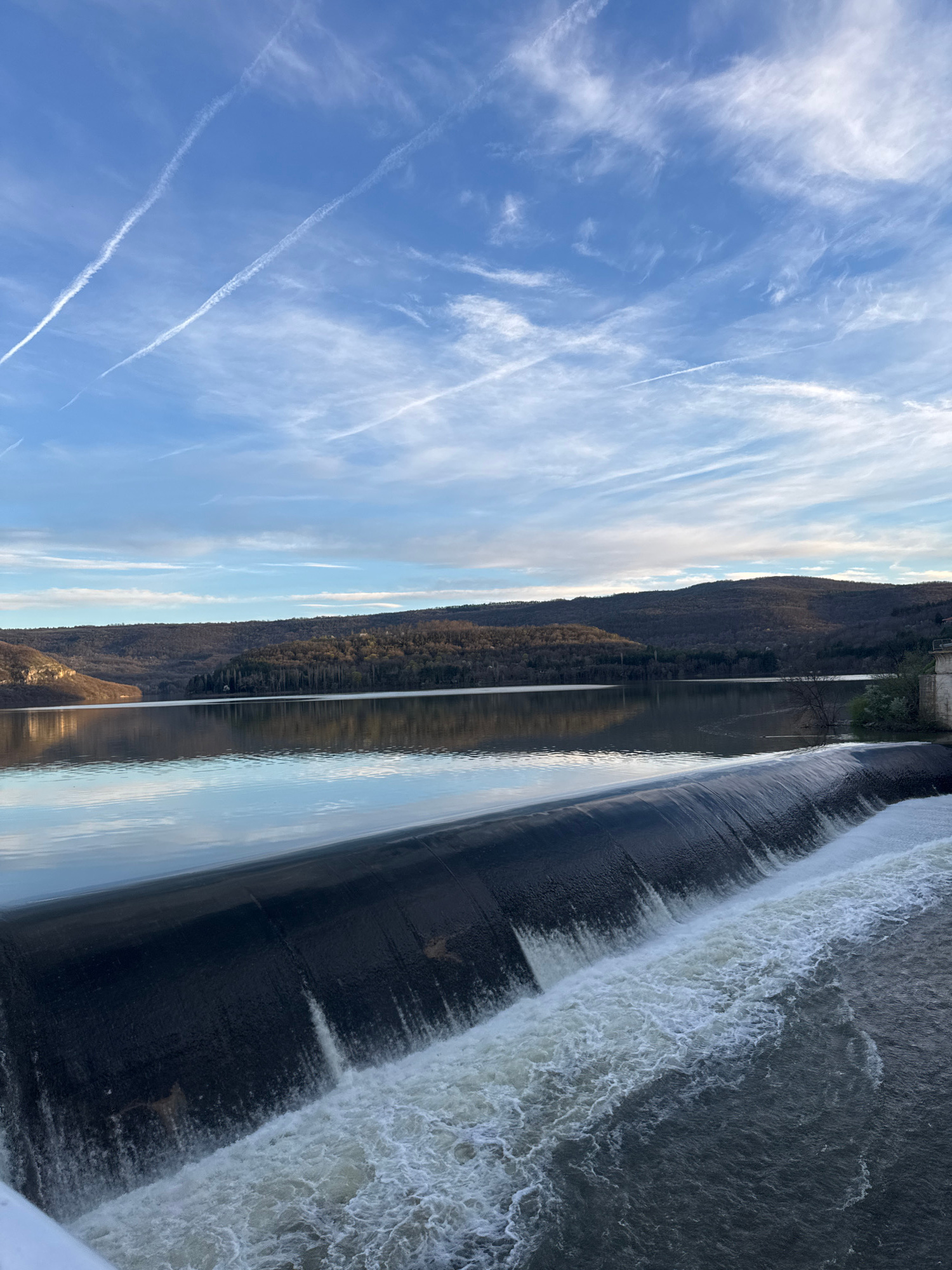 The image shows a dam with water cascading over it. A narrow body of water stretches behind the dam, reflecting the sky and clouds. Trees line the banks of the water. The sky is blue with wispy clouds…read more