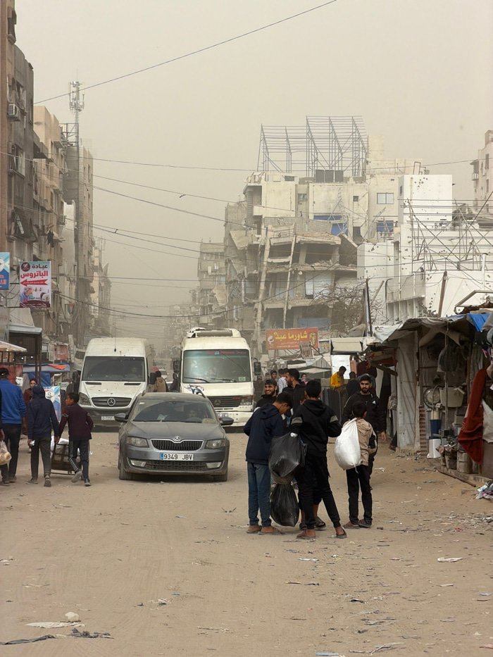 The image captures a bustling street scene in an urban environment, dominated by a pervasive dusty or hazy atmosphere that lends a light brown hue to the sky and distant buildings. The overall impress…read more
