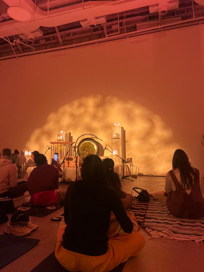 The image shows a dimly lit room, likely an event space, hosting a group of people seated on yoga mats. A large gong and other musical instruments are set up on a stage. A spotlight casts an ethereal…read more