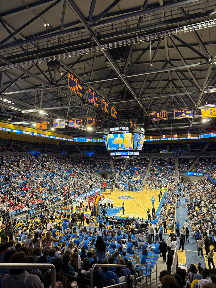 An aerial-perspective image depicts the interior of a packed sports arena, Edwin W. Pauley Pavilion, situated in Los Angeles, California. The central hardwood court, light brown with blue boundary lin…read more