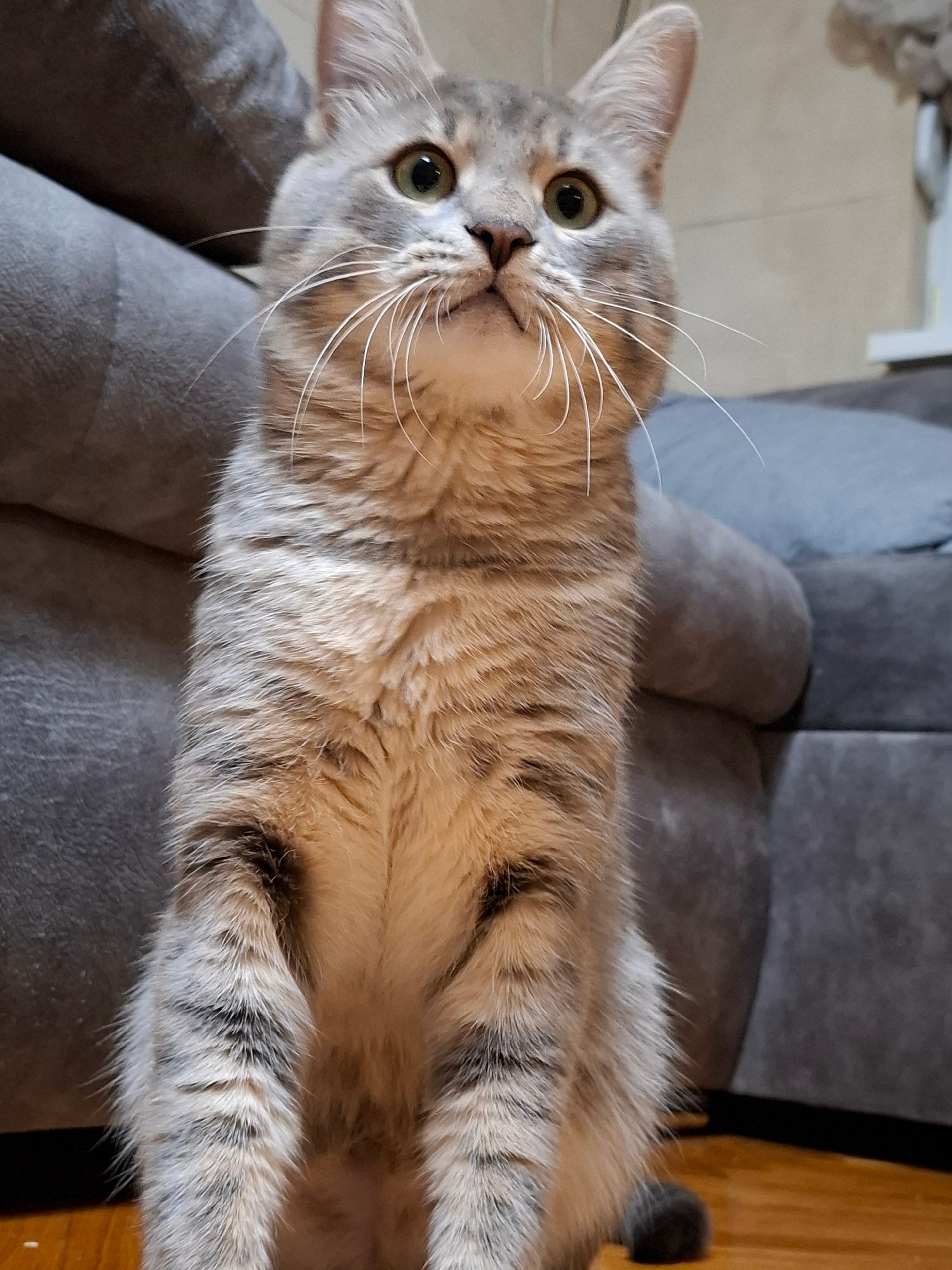 The media file features a domestic cat captured indoors. The cat is the primary subject, lying on a grey upholstered surface, likely a sofa or armchair, and looking upwards and slightly to its left. I…read more