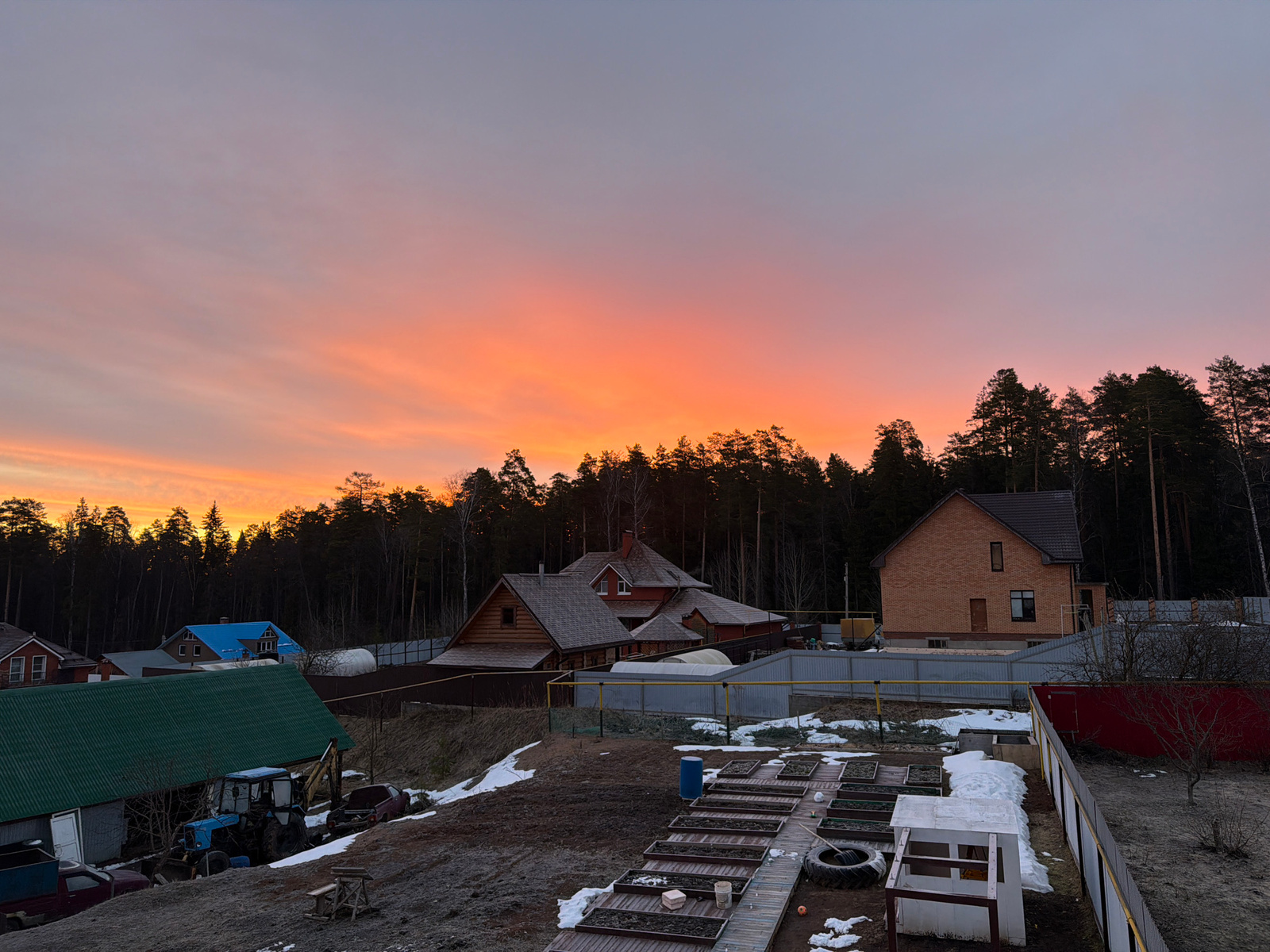 The image depicts a residential area near Chaikovsky, Russia, at sunset. The sky is a gradient of orange and pink. In the middle ground, several houses are visible, including a wooden house with an o…read more